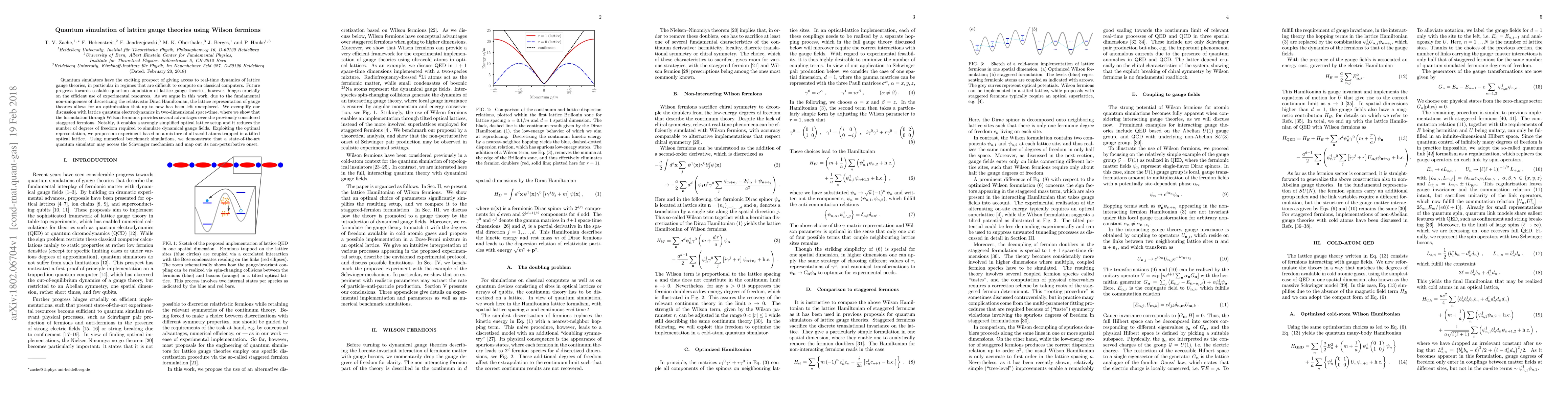 This paper explores the quantum simulation of lattice gauge theories using Wilson fermions, highlighting their advantages over staggered fermions, particularly in reducing complexity and degrees of freedom. The authors propose an experimental setup with ultracold atoms in an optical lattice to simulate these theories, demonstrating the potential to observe the Schwinger mechanism.
