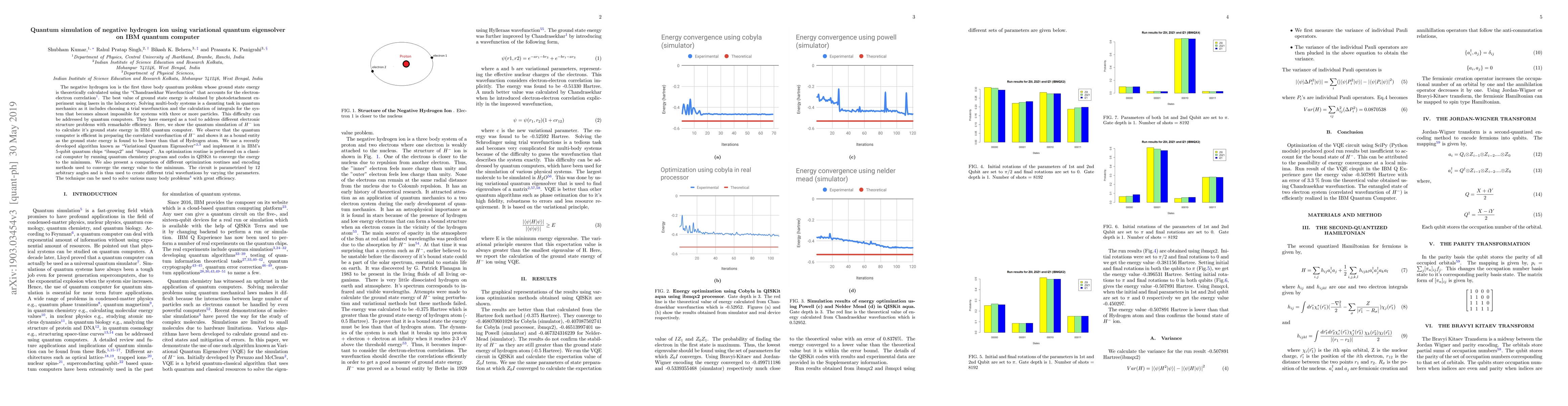 This paper demonstrates the quantum simulation of the negative hydrogen ion (H^{-}) using a Variational Quantum Eigensolver on IBM's quantum computer, achieving a ground state energy of -0.5339355468 Hartree with an error of 0.8376% compared to theoretical values. The study highlights the efficiency of quantum computers in solving multi-body quantum problems.