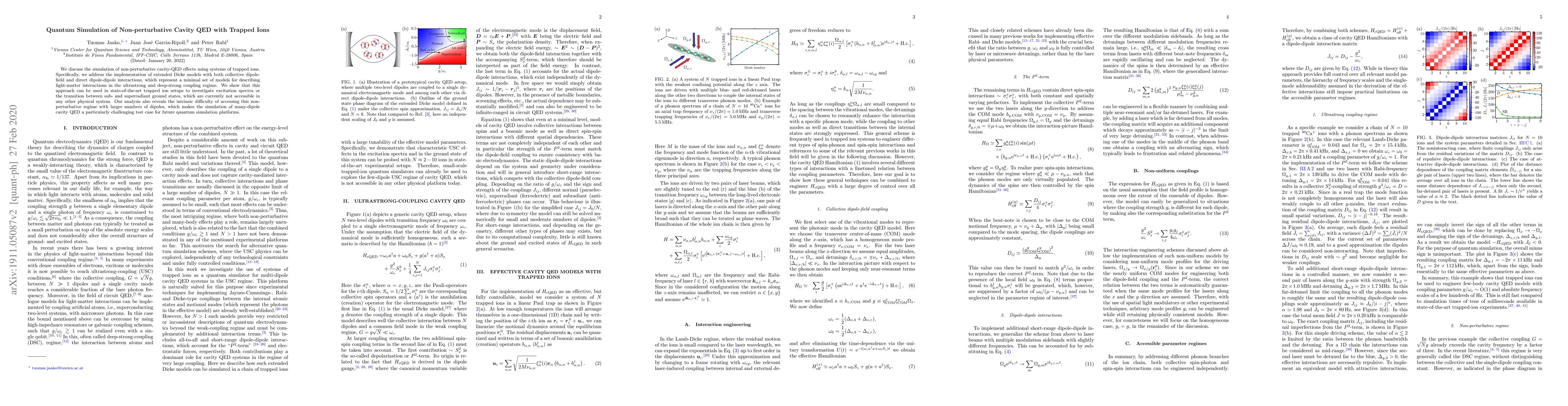 This paper explores the simulation of non-perturbative cavity-QED effects using trapped ions, implementing extended Dicke models for ultrastrong light-matter interactions. The study highlights the potential of trapped ion systems to investigate phenomena like excitation spectra and transitions between sub- and superradiant states, though it also notes the challenges in scaling up to many dipoles.