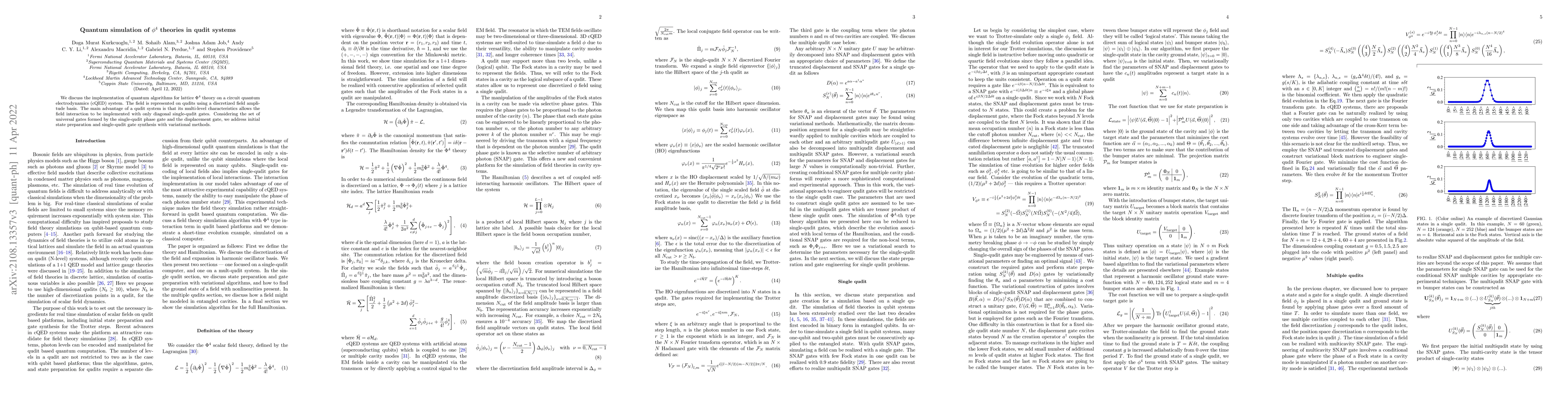We discuss the implementation of quantum algorithms for lattice $\Phi^4$ theory on circuit quantum electrodynamics (cQED) system. The field is represented on qudits in a discretized field amplitude basis. The main advantage of qudit systems is that its multi-level characteristic allows the field interaction to be implemented only with diagonal single-qudit gates. Considering the set of universal gates formed by the single-qudit phase gate and the displacement gate, we address initial state preparation and single-qudit gate synthesis with variational methods.