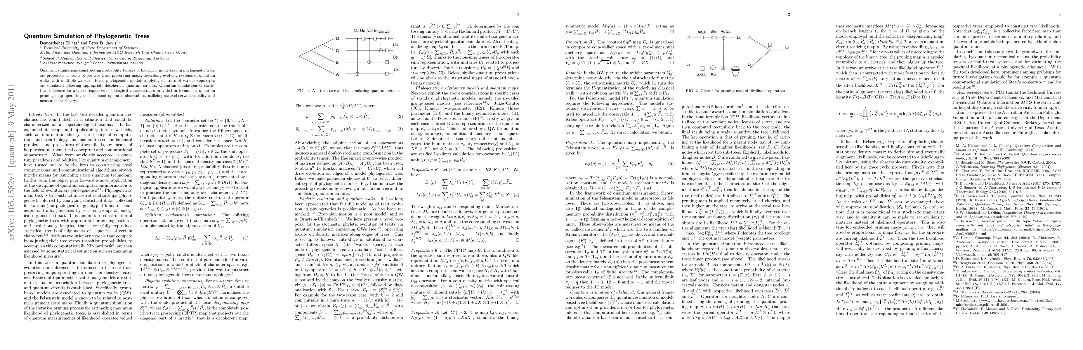 This paper proposes quantum simulations for phylogenetic trees using quantum walks and positive trace preserving maps, simulating evolving systems and statistical inference for biological character sequences through decoherent quantum circuits and quantum pruning maps.