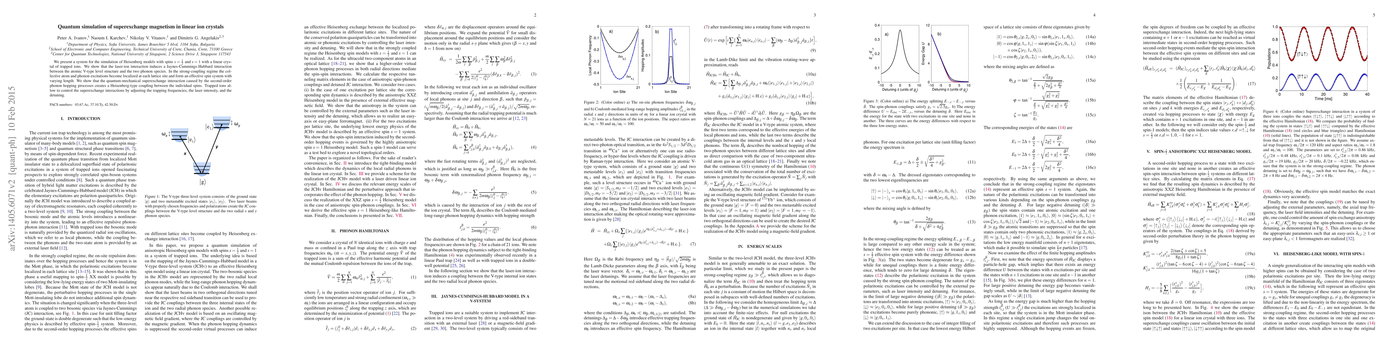 We present a system for the simulation of Heisenberg models with spins $s=\frac{1}{2}$ and $s=1$ with a linear crystal of trapped ions. We show that the laser-ion interaction induces a Jaynes-Cummings-Hubbard interaction between the atomic V-type level structure and the two phonon species. In the strong-coupling regime the collective atom and phonon excitations become localized at each lattice site and form an effective spin system with varying length. We show that the quantum-mechanical superexchange interaction caused by the second-order phonon hopping processes creates a Heisenberg-type coupling between the individual spins. Trapped ions allow to control the superexchange interactions by adjusting the trapping frequencies, the laser intensity, and the detuning.