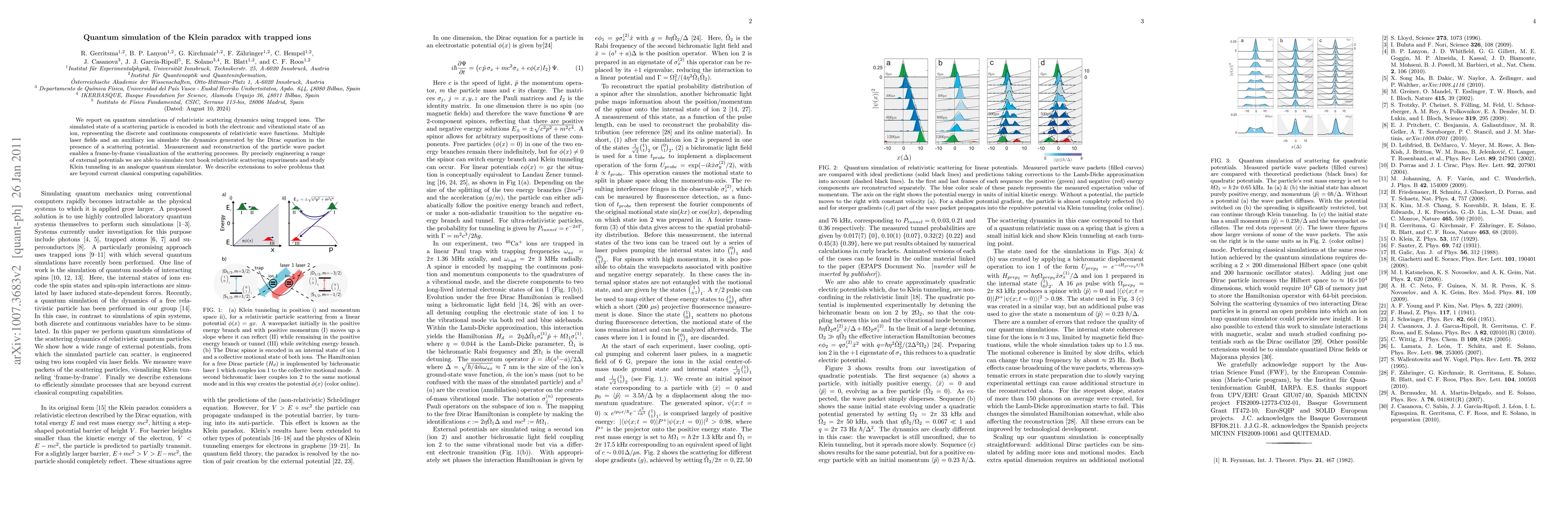 This research presents a quantum simulation of the Klein paradox using trapped ions, encoding particle states in both electronic and vibrational ion states. Laser fields and an auxiliary ion mimic Dirac equation dynamics, enabling visualization of scattering processes and study of Klein tunneling. The method showcases potential for solving problems beyond classical computing capabilities.