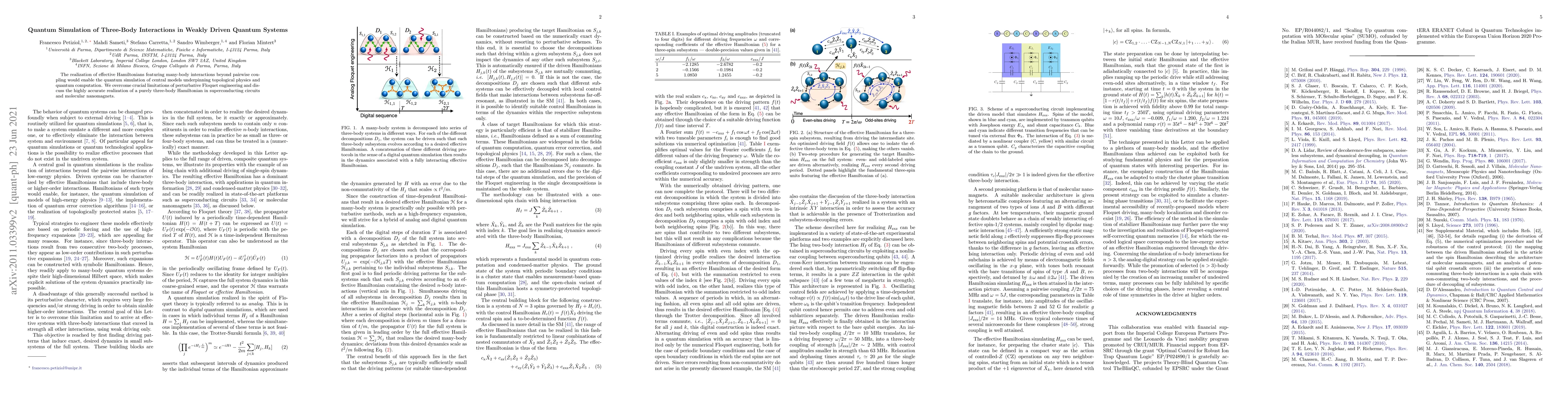 Summary: This paper presents a method for accurately simulating three-body interactions in weakly driven quantum systems using superconducting circuits and molecular nanomagnets, overcoming limitations of traditional perturbative approaches. The technique enables the quantum simulation of models crucial for topological physics and quantum computation.
