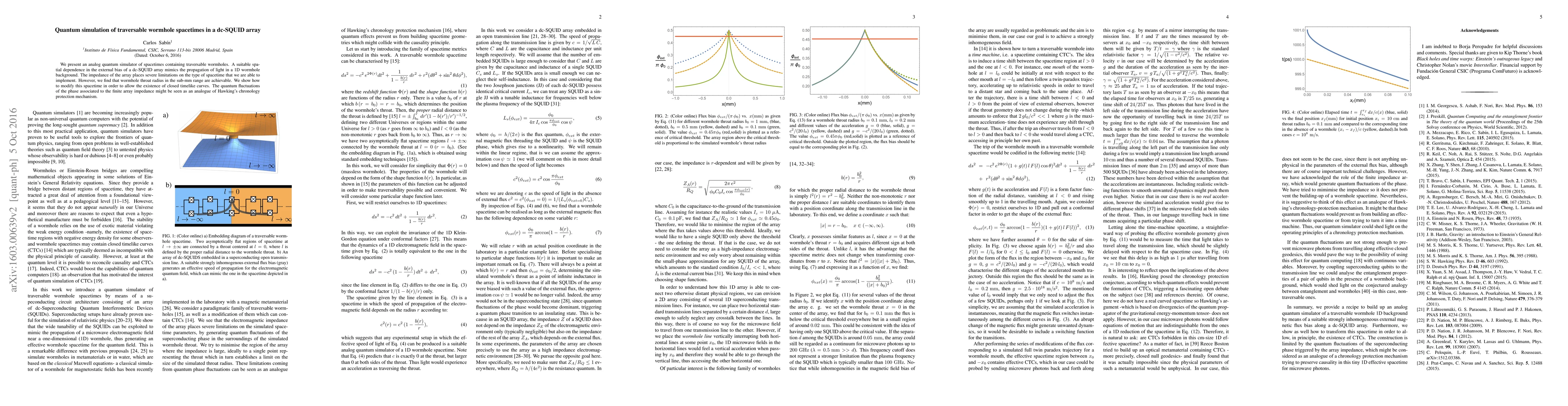 This paper describes an analog quantum simulator using a dc-SQUID array to mimic traversable wormhole spacetimes, achieving wormhole throats in the sub-mm range. The study also explores modifications to allow for closed timelike curves and suggests that quantum fluctuations in the array may emulate Hawking's chronology protection mechanism.