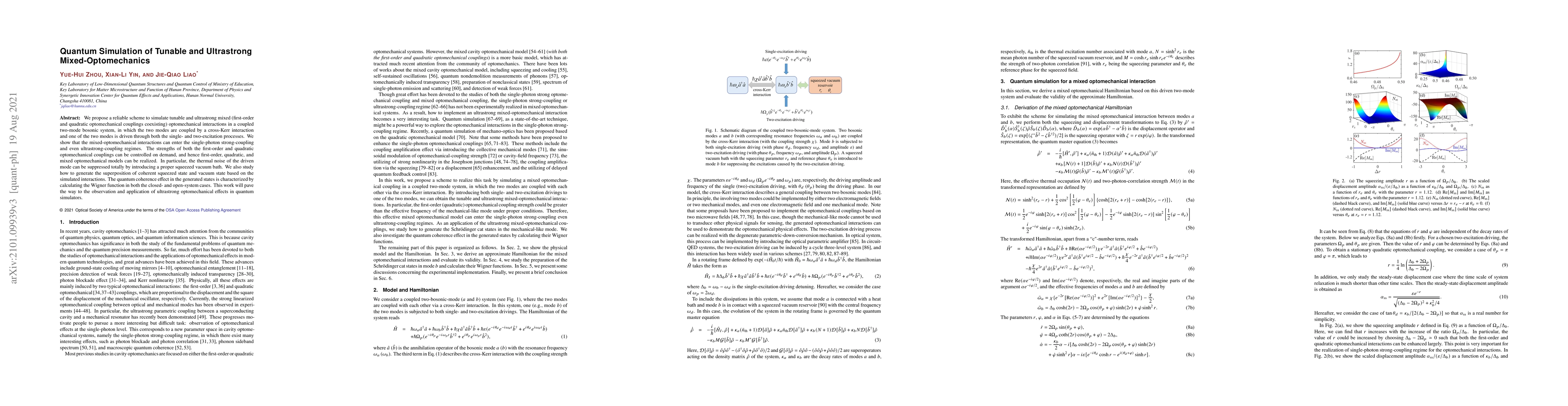 We propose a reliable scheme to simulate tunable and ultrastrong mixed (first-order and quadratic optomechanical couplings coexisting) optomechanical interactions in a coupled two-mode bosonic system, in which the two modes are coupled by a cross-Kerr interaction and one of the two modes is driven through both the single- and two-excitation processes. We show that the mixed-optomechanical interactions can enter the single-photon strong-coupling and even ultrastrong-coupling regimes. The strengths of both the first-order and quadratic optomechanical couplings can be controlled on demand, and hence first-order, quadratic, and mixed optomechanical models can be realized. In particular, the thermal noise of the driven mode can be suppressed totally by introducing a proper squeezed vacuum bath. We also study how to generate the superposition of coherent squeezed state and vacuum state based on the simulated interactions. The quantum coherence effect in the generated states is characterized by calculating the Wigner function in both the closed- and open-system cases. This work will pave the way to the observation and application of ultrastrong optomechanical effects in quantum simulators.
