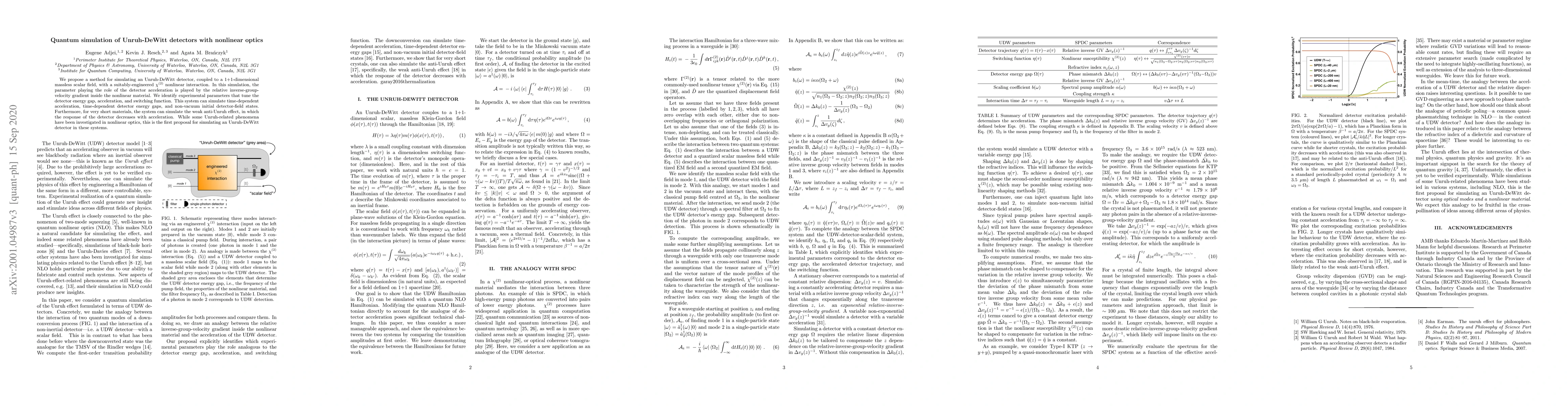 We propose a method for simulating an Unruh-DeWitt detector, coupled to a 1+1-dimensional massless scalar field, with a suitably-engineered $\chi^{(2)}$ nonlinear interaction. In this simulation, the parameter playing the role of the detector acceleration is played by the relative inverse-group-velocity gradient inside the nonlinear material. We identify experimental parameters that tune the detector energy gap, acceleration, and switching function. This system can simulate time-dependent acceleration, time-dependent detector energy gaps, and non-vacuum initial detector-field states. Furthermore, for very short materials, the system can simulate the weak anti-Unruh effect, in which the response of the detector decreases with acceleration. While some Unruh-related phenomena have been investigated in nonlinear optics, this is the first proposal for simulating an Unruh-DeWitt detector in these systems.