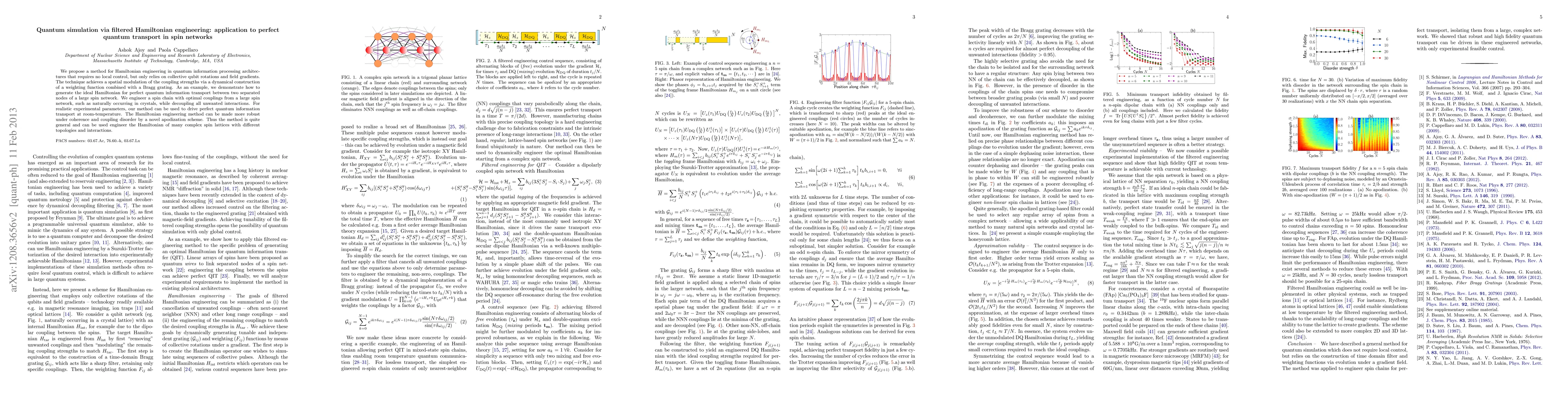This paper proposes a novel method for Hamiltonian engineering in quantum information systems that uses collective qubit rotations and field gradients without local control, enabling perfect quantum transport in spin networks. The technique employs a dynamical weighting function and Bragg grating to modulate coupling strengths, demonstrating its application in achieving optimal couplings in a spin chain.