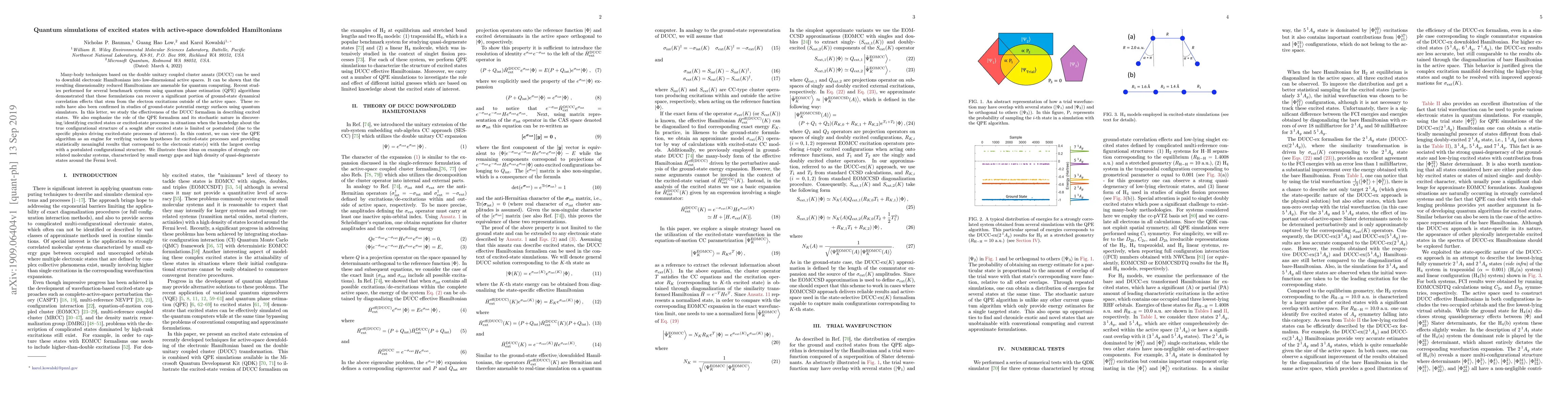 Many-body techniques based on the double unitary coupled cluster ansatz (DUCC) can be used to downfold electronic Hamiltonians into low-dimensional active spaces. It can be shown that the resulting dimensionality reduced Hamiltonians are amenable for quantum computing. Recent studies performed for several benchmark systems using quantum phase estimation (QPE) algorithms demonstrated that these formulations can recover a significant portion of ground-state dynamical correlation effects that stem from the electron excitations outside of the active space. These results have also been confirmed in studies of ground-state potential energy surfaces using quantum simulators. In this letter, we study the effectiveness of the DUCC formalism in describing excited states. We also emphasize the role of the QPE formalism and its stochastic nature in discovering/identifying excited states or excited-state processes in situations when the knowledge about the true configurational structure of a sought after excited state is limited or postulated (due to the specific physics driving excited-state processes of interest). In this context, we can view the QPE algorithm as an engine for verifying various hypotheses for excited-state processes and providing statistically meaningful results that correspond to the electronic state(s) with the largest overlap with a postulated configurational structure. We illustrate these ideas on examples of strongly correlated molecular systems, characterized by small energy gaps and high density of quasi-degenerate states around the Fermi level.