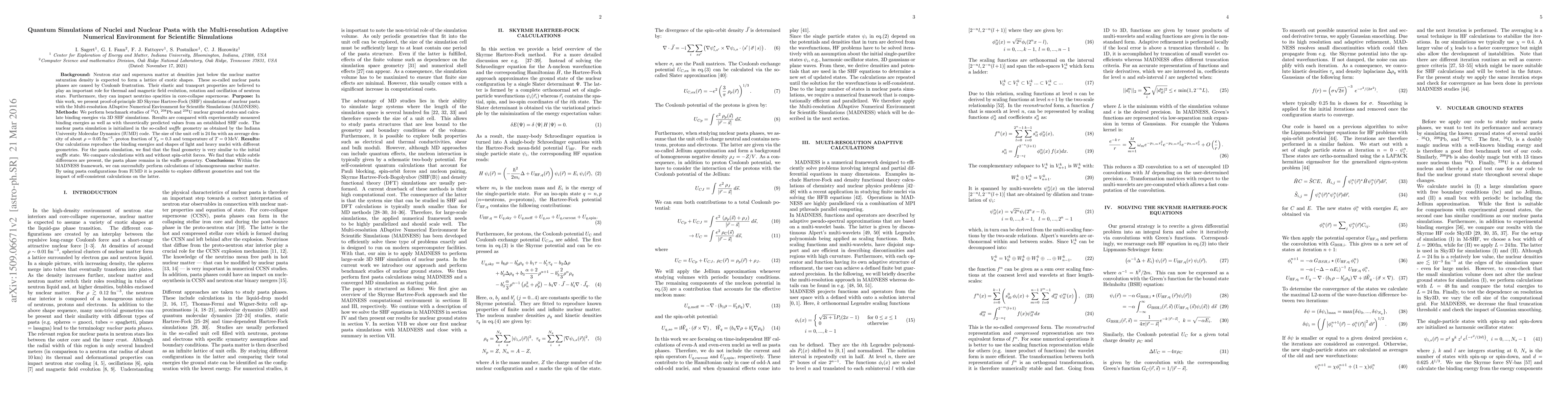 Neutron star and supernova matter at densities just below the nuclear matter saturation density is expected to form a lattice of exotic shapes. These so-called nuclear pasta phases are caused by Coulomb frustration. Their elastic and transport properties are believed to play an important role for thermal and magnetic field evolution, rotation and oscillation of neutron stars. Furthermore, they can impact neutrino opacities in core-collapse supernovae. In this work, we present proof-of-principle 3D Skyrme Hartree-Fock (SHF) simulations of nuclear pasta with the Multi-resolution ADaptive Numerical Environment for Scientific Simulations (MADNESS). We perform benchmark studies of $^{16} \mathrm{O}$, $^{208} \mathrm{Pb}$ and $^{238} \mathrm{U}$ nuclear ground states and calculate binding energies via 3D SHF simulations. Results are compared with experimentally measured binding energies as well as with theoretically predicted values from an established SHF code. The nuclear pasta simulation is initialized in the so-called waffle geometry as obtained by the Indiana University Molecular Dynamics (IUMD) code. The size of the unit cell is 24\:fm with an average density of about $\rho = 0.05 \:\mathrm{fm}^{-3}$, proton fraction of $Y_p = 0.3$ and temperature of $T=0\:$MeV. Our calculations reproduce the binding energies and shapes of light and heavy nuclei with different geometries. For the pasta simulation, we find that the final geometry is very similar to the initial waffle state. In the present pasta calculations spin-orbit forces are not included but will be added in the future. Within the MADNESS framework, we can successfully perform calculations of inhomogeneous nuclear matter. By using pasta configurations from IUMD it is possible to explore different geometries and test the impact of self-consistent calculations on the latter.