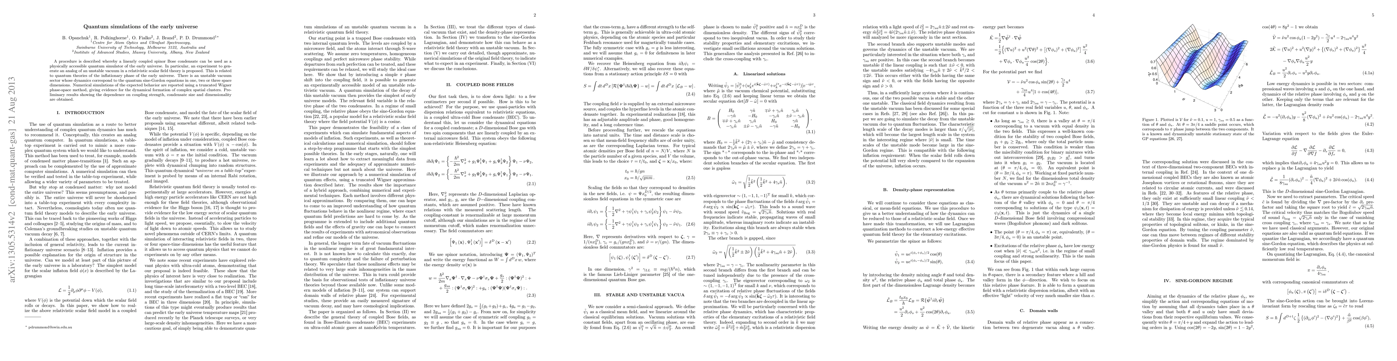A procedure is described whereby a linearly coupled spinor Bose condensate can be used as a physically accessible quantum simulator of the early universe. In particular, an experiment to generate an analog of an unstable vacuum in a relativistic scalar field theory is proposed. This is related to quantum theories of the inflationary phase of the early universe. There is an unstable vacuum sector whose dynamics correspond to the quantum sine-Gordon equations in one, two or three space dimensions. Numerical simulations of the expected behavior are reported using a truncated Wigner phase-space method, giving evidence for the dynamical formation of complex spatial clusters. Preliminary results showing the dependence on coupling strength, condensate size and dimensionality are obtained.