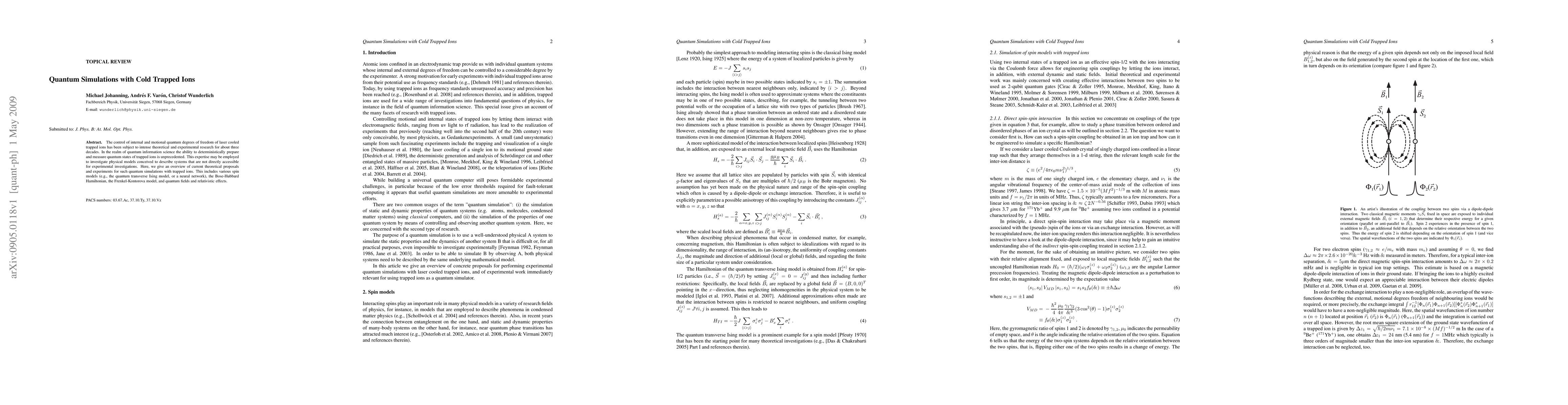 This paper reviews theoretical and experimental advancements in quantum simulations using cold trapped ions, focusing on their ability to model complex physical systems like spin models, the Bose-Hubbard Hamiltonian, and relativistic effects, which are otherwise difficult to investigate experimentally.
