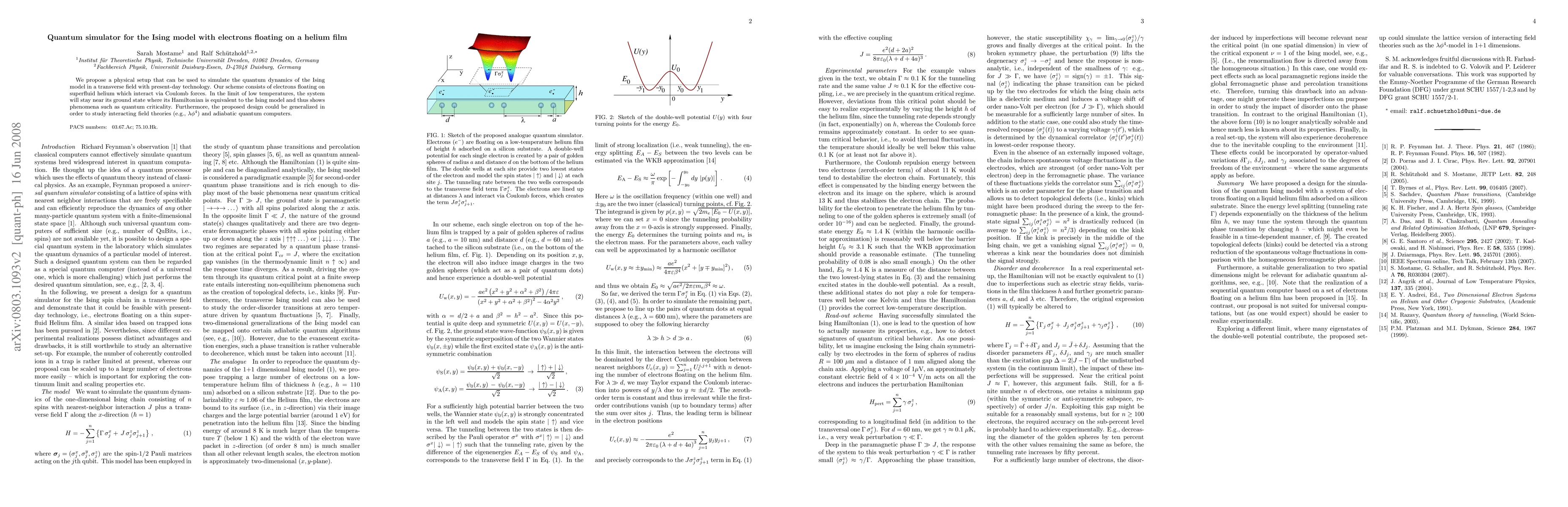 This paper proposes a quantum simulator using electrons on superfluid helium to mimic the Ising model's dynamics, showcasing quantum criticality at low temperatures. The design can also be extended to study interacting field theories and quantum computing.