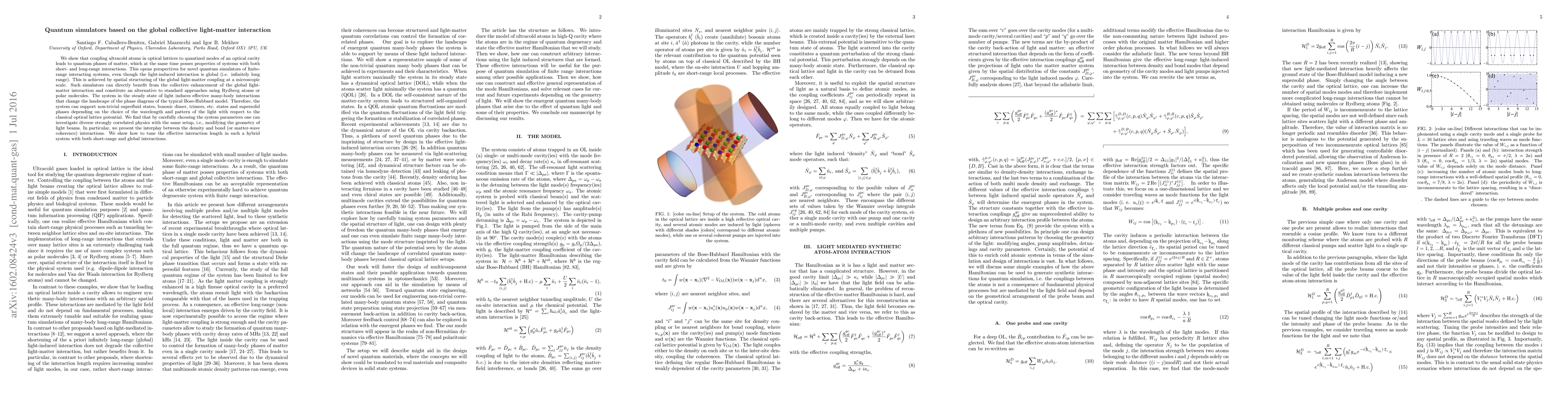 We show that coupling ultracold atoms in optical lattices to quantized modes of an optical cavity leads to quantum phases of matter, which at the same time posses properties of systems with both short- and long-range interactions. This opens perspectives for novel quantum simulators of finite-range interacting systems, even though the light-induced interaction is global (i.e. infinitely long range). This is achieved by spatial structuring of the global light-matter coupling at a microscopic scale. Such simulators can directly benefit from the collective enhancement of the global light-matter interaction and constitute an alternative to standard approaches using Rydberg atoms or polar molecules. The system in the steady state of light induces effective many-body interactions that change the landscape of the phase diagram of the typical Bose-Hubbard model. Therefore, the system can support non-trivial superfluid states, bosonic dimer, trimers, etc. states and supersolid phases depending on the choice of the wavelength and pattern of the light with respect to the classical optical lattice potential. We find that by carefully choosing the system parameters one can investigate diverse strongly correlated physics with the same setup, i.e., modifying the geometry of light beams. In particular, we present the interplay between the density and bond (or matter-wave coherence) interactions. We show how to tune the effective interaction length in such a hybrid system with both short-range and global interactions.