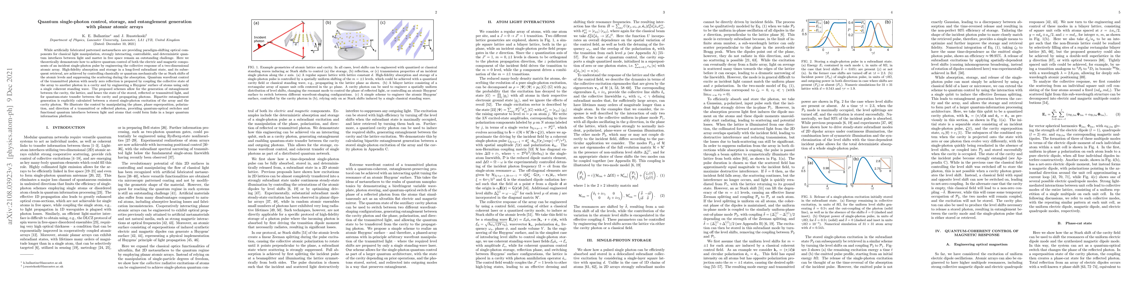 While artificially fabricated patterned metasurfaces are providing paradigm-shifting optical components for classical light manipulation, strongly interacting, controllable, and deterministic quantum interfaces between light and matter in free space remain an outstanding challenge. Here we theoretically demonstrate how to achieve quantum control of both the electric and magnetic components of an incident single-photon pulse by engineering the collective response of a two-dimensional atomic array. High-fidelity absorption and storage in a long-lived subradiant state, and its subsequent retrieval, are achieved by controlling classically or quantum mechanically the ac Stark shifts of the atomic levels and suppressing the scattering during the absorption. Quantum wavefront control of the transmitted photon with nearly zero reflection is prepared by coupling the collective state of the array to another photon in a cavity and by engineering a Huygens' surface of atoms using only a single coherent standing wave. The proposed schemes allow for the generation of entanglement between the cavity, the lattice, and hence the state of the stored, reflected or transmitted light, and for quantum-state transfer between the cavity and propagating photons. Bipartite entanglement generation is explicitly calculated between a stored single-photon excitation of the array and the cavity photon. We illustrate the control by manipulating the phase, phase superposition, polarization, and direction of a transmitted or reflected photon, providing quantum-optical switches and functional quantum interfaces between light and atoms that could form links in a larger quantum information platform.