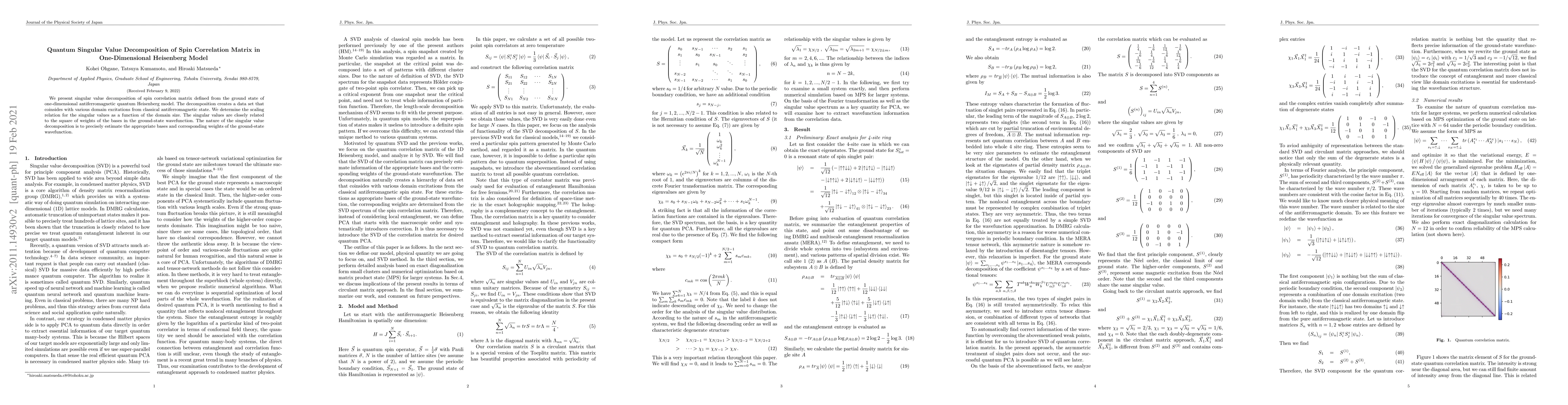 This paper decomposes the spin correlation matrix from the ground state of a one-dimensional Heisenberg model using quantum singular value decomposition, revealing domain excitations and determining a scaling relation for singular values tied to domain size and ground-state wavefunction weights.