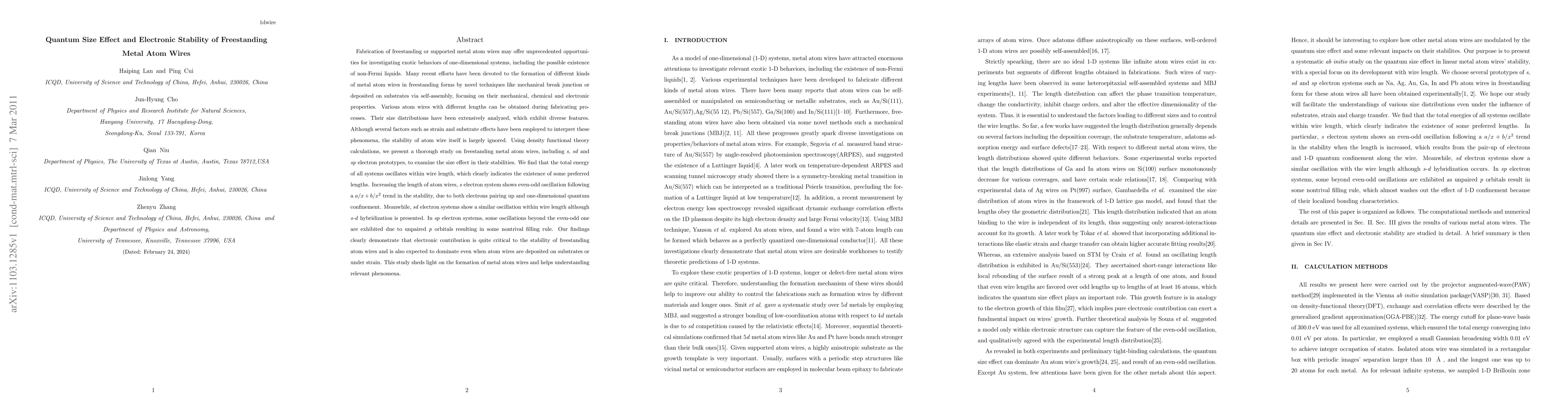 This study uses DFT calculations to investigate quantum size effects on the stability of freestanding metal atom wires, revealing oscillatory total energy patterns indicating preferred lengths. The stability of s-system wires follows an even-odd oscillation pattern, while sp-system wires show more complex oscillations due to unpaired p orbitals.