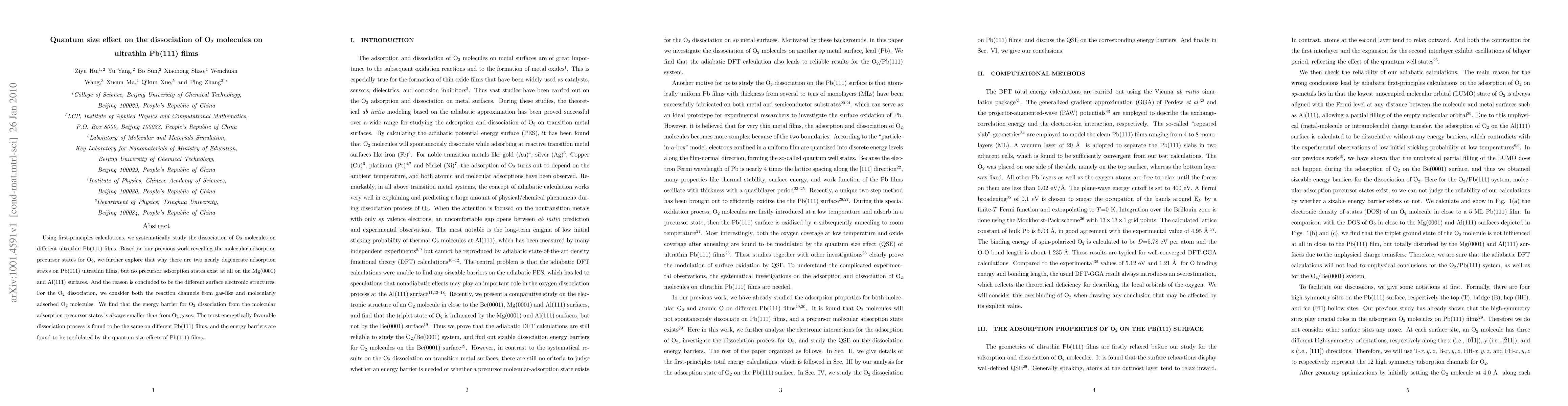 This study uses first-principles calculations to investigate the dissociation of O$_2$ molecules on ultrathin Pb(111) films, finding that the energy barrier for dissociation from molecularly adsorbed states is lower than from gas-like molecules, with quantum size effects influencing the energy barriers. The different surface electronic structures explain the absence of precursor states on Mg(0001) and Al(111) surfaces.
