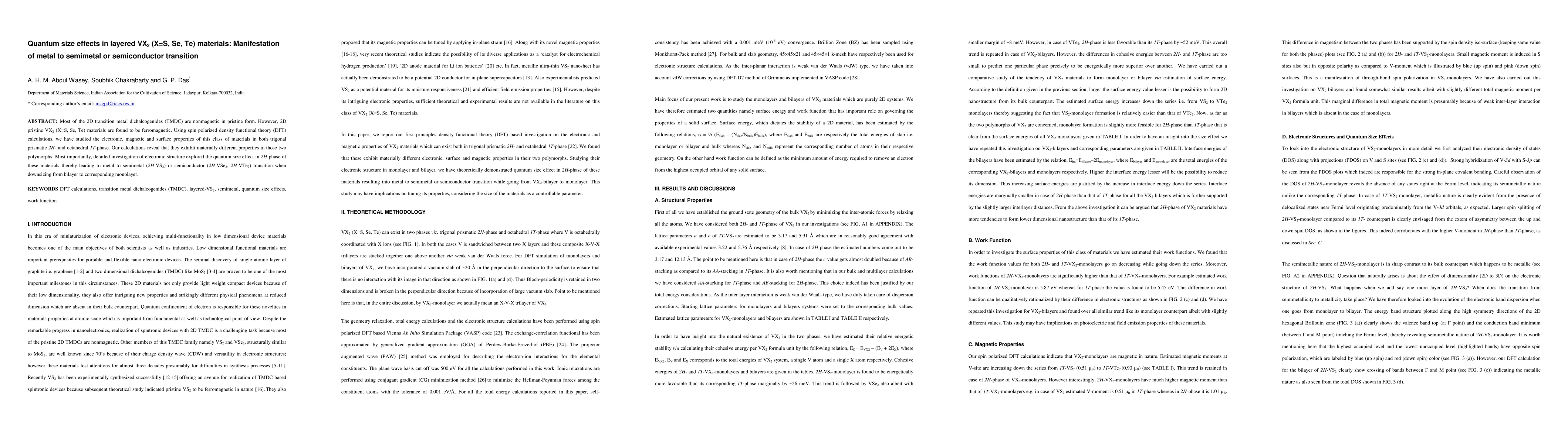 This paper investigates the quantum size effects in layered VX2 (X=S, Se, Te) materials, revealing that 2H-phase materials undergo metal to semimetal or semiconductor transitions when reduced from bilayer to monolayer, as demonstrated through spin-polarized density functional theory calculations. The study highlights significant differences in electronic and magnetic properties between the 2H- and 1T-phase polymorphs.