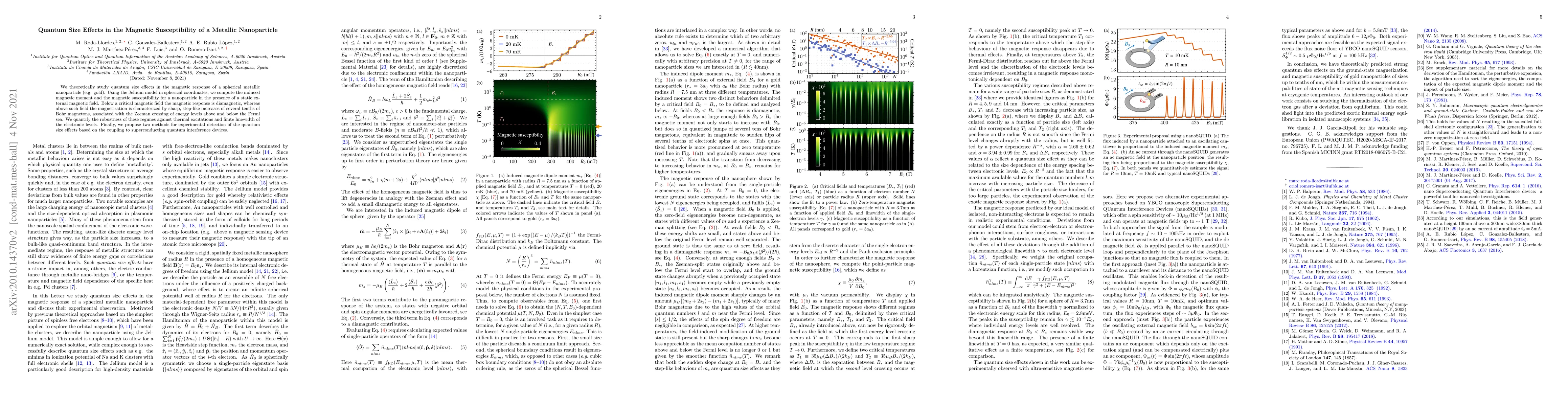 This paper theoretically investigates quantum size effects on the magnetic susceptibility of spherical metallic nanoparticles using the Jellium model. It finds diamagnetic behavior below a critical field, with sharp increases in magnetization above it, linked to Zeeman level crossings. The study also explores the effects of thermal excitations and proposes methods for experimental detection using superconducting quantum interference devices.