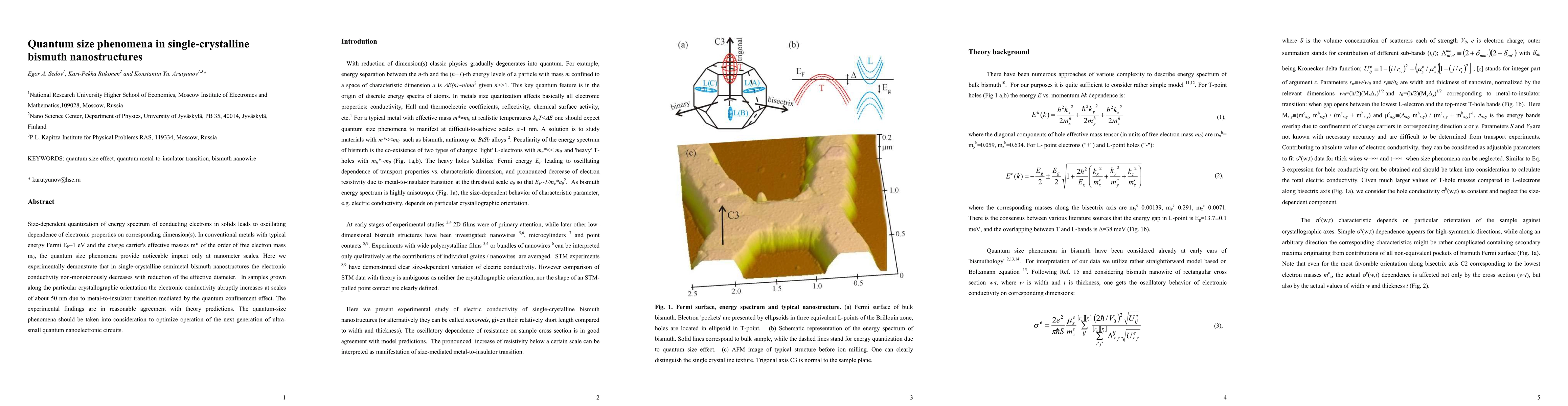 Size-dependent quantization of energy spectrum of conducting electrons in solids leads to oscillating dependence of electronic properties on corresponding dimension(s). In conventional metals with typical energy Fermi EF~1 eV and the charge carrier's effective masses m* of the order of free electron mass m0, the quantum size phenomena provide noticeable impact only at nanometer scales. Here we experimentally demonstrate that in single-crystalline semimetal bismuth nanostructures the electronic conductivity non-monotonously decreases with reduction of the effective diameter. In samples grown along the particular crystallographic orientation the electronic conductivity abruptly increases at scales of about 50 nm due to metal-to-insulator transition mediated by the quantum confinement effect. The experimental findings are in reasonable agreement with theory predictions. The quantum-size phenomena should be taken into consideration to optimize operation of the next generation of ultra-small quantum nanoelectronic circuits.