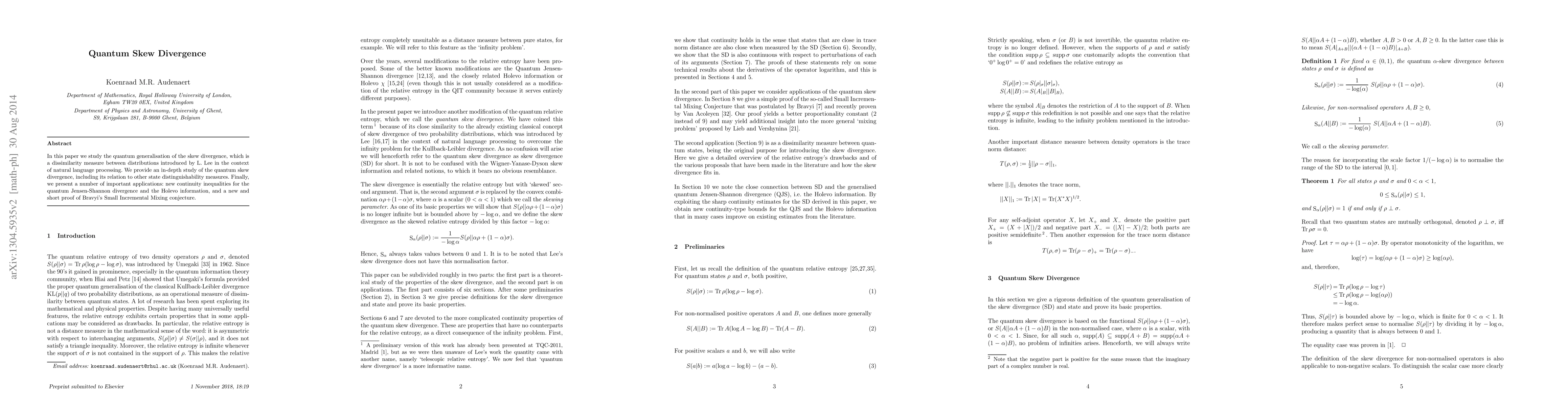 In this paper we study the quantum generalisation of the skew divergence, which is a dissimilarity measure between distributions introduced by L. Lee in the context of natural language processing. We provide an in-depth study of the quantum skew divergence, including its relation to other state distinguishability measures. Finally, we present a number of important applications: new continuity inequalities for the quantum Jensen-Shannon divergence and the Holevo information, and a new and short proof of Bravyi's Small Incremental Mixing conjecture.
