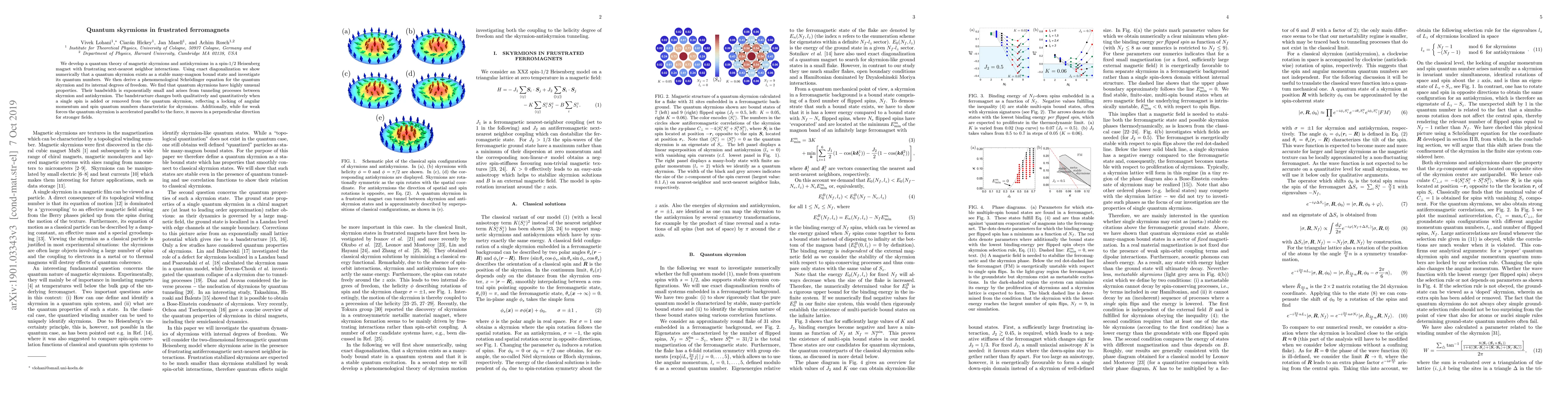 We develop a quantum theory of magnetic skyrmions and antiskyrmions in a spin-1/2 Heisenberg magnet with frustrating next-nearest neighbor interactions. Using exact diagonalization we show numerically that a quantum skyrmion exists as a stable many-magnon bound state and investigate its quantum numbers. We then derive a phenomenological Schr\"odinger equation for the quantum skyrmion and its internal degrees of freedom. We find that quantum skyrmions have highly unusual properties. Their bandwidth is exponentially small and arises from tunneling processes between skyrmion and antiskyrmion. The bandstructure changes both qualitatively and quantitatively when a single spin is added or removed from the quantum skyrmion, reflecting a locking of angular momentum and spin quantum numbers characteristic for skyrmions. Additionally, while for weak forces the quantum skyrmion is accelerated parallel to the force, it moves in a perpendicular direction for stronger fields.