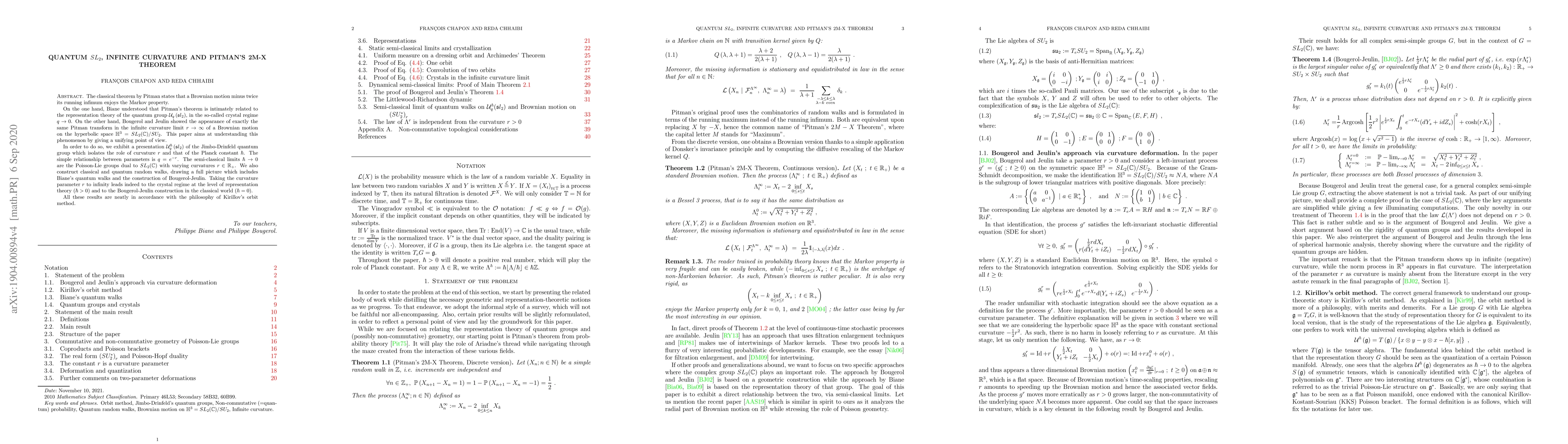 This paper unifies Pitman's Markov theorem with quantum group representation theory and infinite curvature limits on hyperbolic space SL_2(C)/SU(2). It introduces a quantum group presentation $mathcal{U}_q^hbar(mathfrak{sl}_2)$ that distinguishes curvature and Planck constant, revealing a dual relationship with Poisson-Lie groups. The study also connects Biane's quantum walks and Bougerol-Jeulin's construction, demonstrating that large curvature leads to the crystal regime in quantum theory and Bougerol-Jeulin's classical result, aligning with Kirillov's orbit method philosophy.