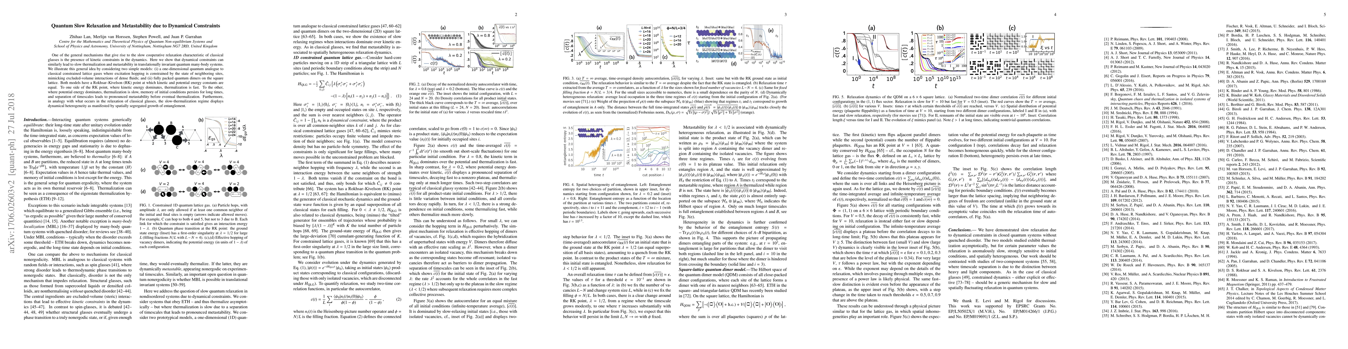This paper demonstrates that dynamical constraints can cause slow thermalization and metastability in quantum many-body systems, analogous to kinetic constraints in classical glasses. It uses two models to illustrate this, showing that near a Rokhsar-Kivelson point, potential energy dominance leads to slow thermalization and pronounced metastability.
