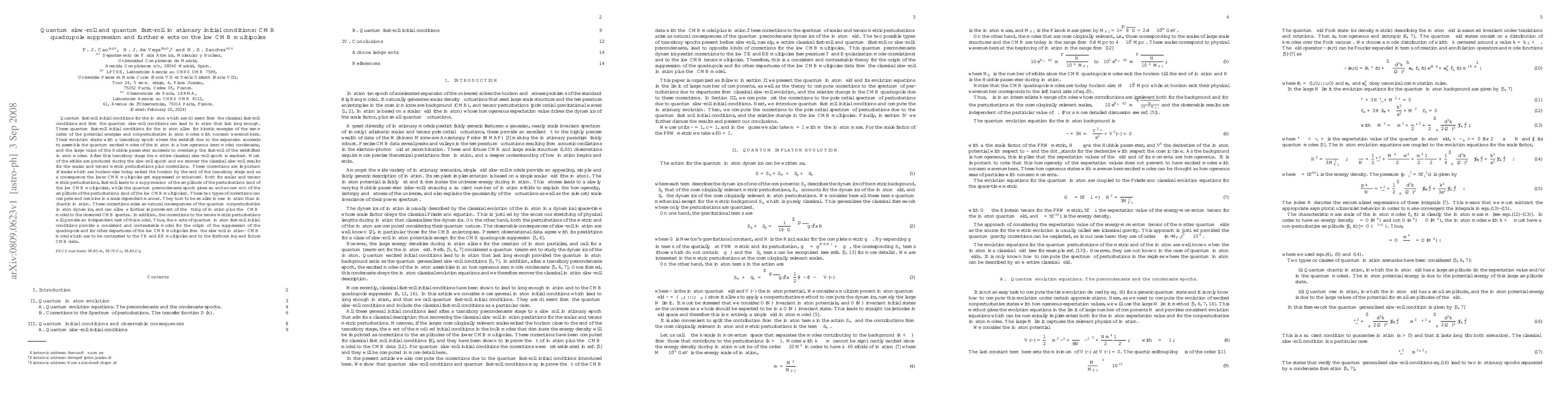 Quantum fast-roll initial conditions for the inflaton which are different from the classical fast-roll conditions and from the quantum slow-roll conditions can lead to inflation that last long enough. These quantum fast-roll initial conditions for the inflaton allow for kinetic energies of the same order of the potential energies and nonperturbative inflaton modes with nonzero wavenumbers. Their evolution starts with a transitory epoch where the redshift due to the expansion succeeds to assemble the quantum excited modes of the inflaton in a homogeneous (zero mode) condensate, and the large value of the Hubble parameter succeeds to overdamp the fast-roll of the redshifted inflaton modes. After this transitory stage the effective classical slow-roll epoch is reached. Most of the efolds are produced during the slow-roll epoch and we recover the classical slow-roll results for the scalar and tensor metric perturbations plus corrections. These corrections are important, both for scalar and for tensor perturbations, if scales which are horizon-size today exited the horizon by the end of the transitory stage and as a consequence the lower CMB multipoles get suppressed (fast-roll) or enhanced (precondensate). These two types of corrections can compete and combine in a scale dependent manner. They arise as natural consequences of the quantum nonperturbative inflaton dynamics, and provide a consistent and contrastable model for the origin of the suppression of the quadrupole and for other departures of the low CMB multipoles from the slow-roll inflation-LambdaCMB model which are to be contrasted to the TE and EE multipoles and to the forthcoming and future CMB data.