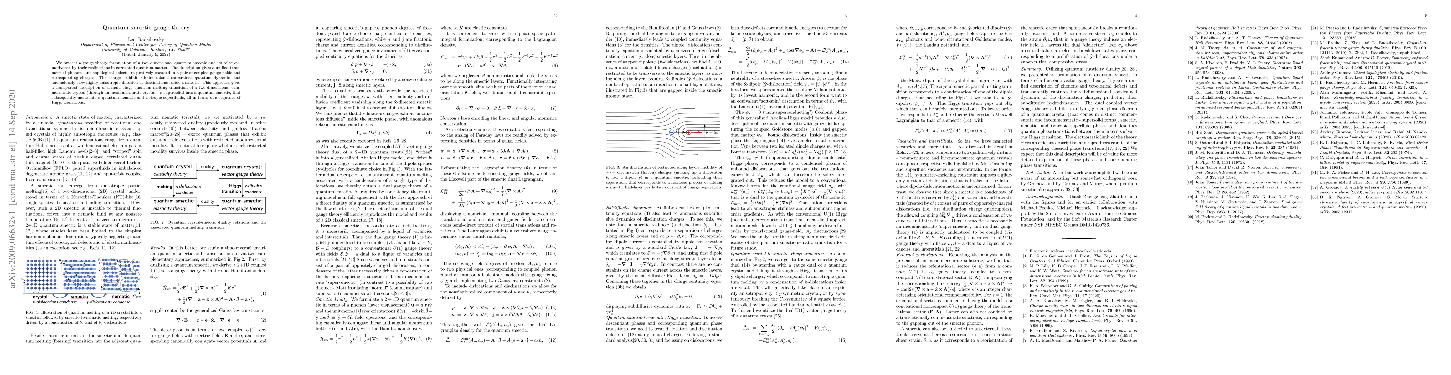 We present a gauge theory formulation of a two-dimensional quantum smectic and its relatives, motivated by their realizations in correlated quantum matter. The description gives a unified treatment of phonons and topological defects, respectively encoded in a pair of coupled gauge fields and corresponding charges. The charges exhibit subdimensional constrained quantum dynamics and anomalously slow highly anisotropic diffusion of disclinations inside a smectic. This approach gives a transparent description of a multi-stage quantum melting transition of a two-dimensional commensurate crystal (through an incommensurate crystal - a supersolid) into a quantum smectic, that subsequently melts into a quantum nematic and isotropic superfluids, all in terms of a sequence of Higgs transitions.