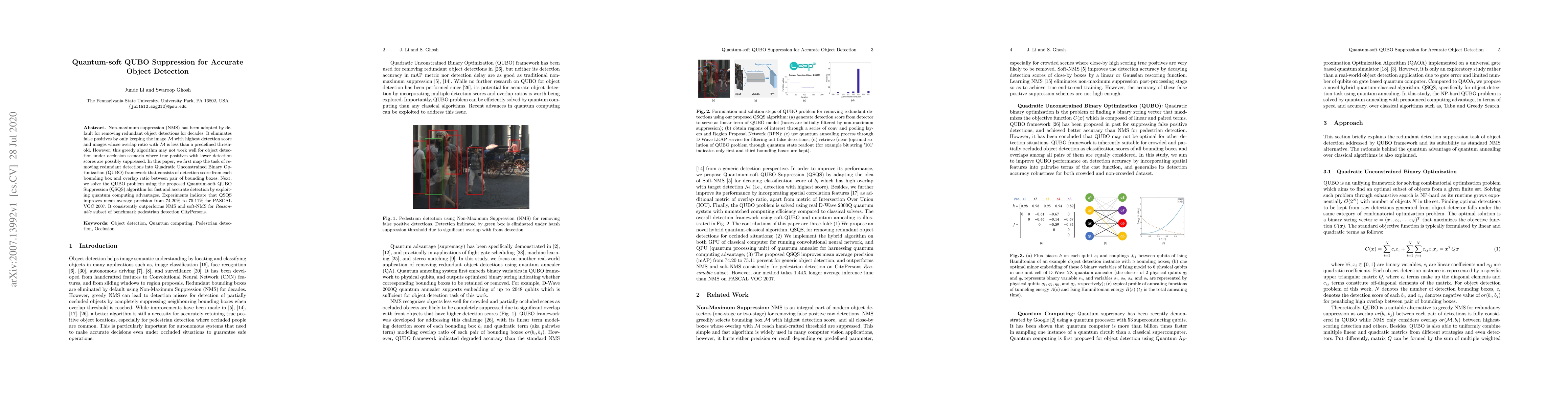 This paper proposes a Quantum-soft QUBO Suppression (QSQS) algorithm to improve object detection accuracy by reformulating non-maximum suppression as a Quadratic Unconstrained Binary Optimization (QUBO) problem, leveraging quantum computing for enhanced performance over traditional NMS methods. Experiments show QSQS achieves a higher mean average precision on PASCAL VOC 2007 and outperforms NMS and soft-NMS on pedestrian detection in CityPersons.