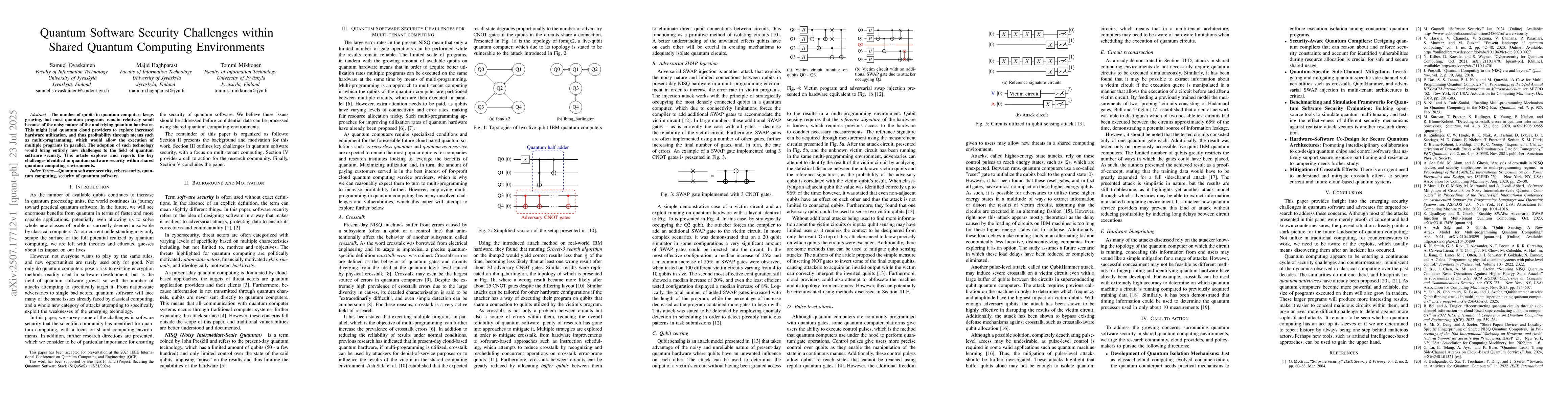 The number of qubits in quantum computers keeps growing, but most quantum programs remain relatively small because of the noisy nature of the underlying quantum hardware. This might lead quantum cloud providers to explore increased hardware utilization, and thus profitability through means such as multi-programming, which would allow the execution of multiple programs in parallel. The adoption of such technology would bring entirely new challenges to the field of quantum software security. This article explores and reports the key challenges identified in quantum software security within shared quantum computing environments.
