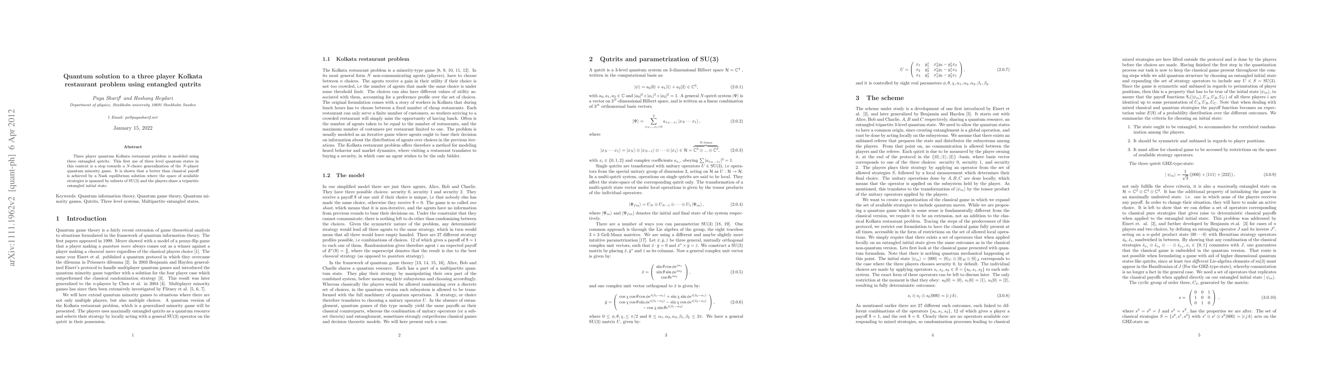 Three player quantum Kolkata restaurant problem is modeled using three entangled qutrits. This first use of three level quantum states in this context is a step towards a $N$-choice generalization of the $N$-player quantum minority game. It is shown that a better than classical payoff is achieved by a Nash equilibrium solution where the space of available strategies is spanned by subsets of SU(3) and the players share a tripartite entangled initial state.