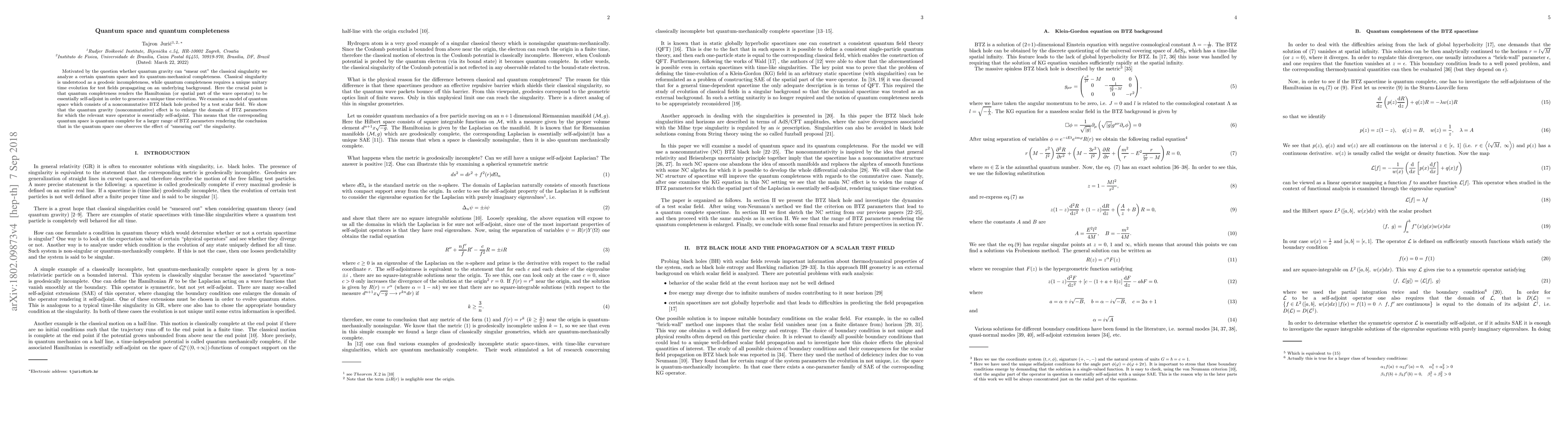 Motivated by the question whether quantum gravity can "smear out" the classical singularity we analyze a certain quantum space and its quantum-mechanical completeness. Classical singularity is understood as a geodesic incompleteness, while quantum completeness requires a unique unitary time evolution for test fields propagating on an underlying background. Here the crucial point is that quantum completeness renders the Hamiltonian (or spatial part of the wave operator) to be essentially self-adjoint in order to generate a unique time evolution. We examine a model of quantum space which consists of a noncommutative BTZ black hole probed by a test scalar field. We show that the quantum gravity (noncommutative) effect is to enlarge the domain of BTZ parameters for which the relevant wave operator is essentially self-adjoint. This means that the corresponding quantum space is quantum complete for a larger range of BTZ parameters rendering the conclusion that in the quantum space one observes the effect of "smearing out" the singularity.