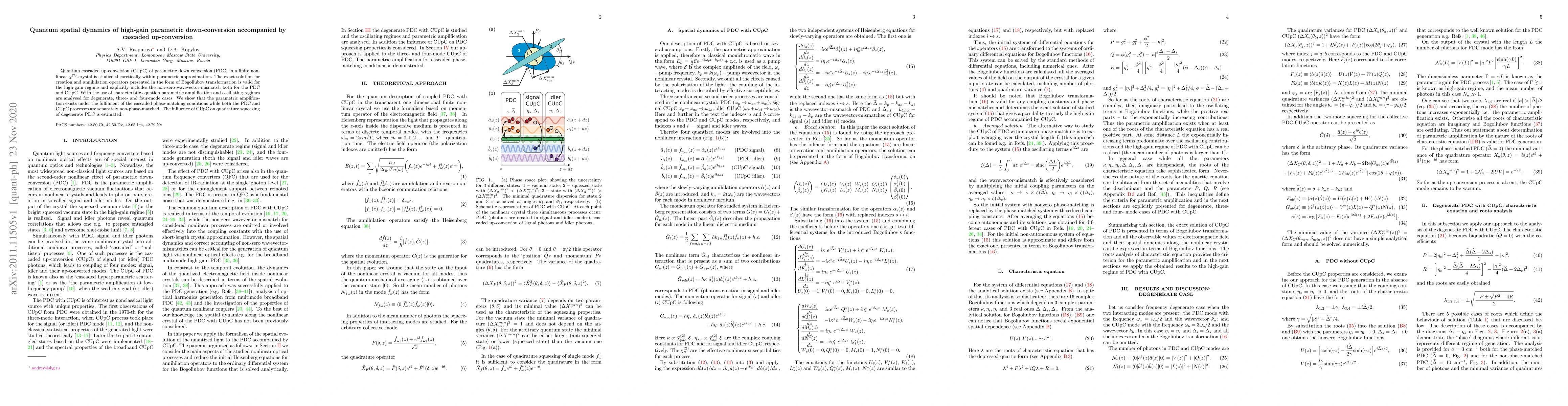 This paper theoretically investigates quantum cascaded up-conversion of parametric down-conversion in finite nonlinear crystals, focusing on high-gain regimes and non-zero wavevector mismatch. It provides exact solutions for creation and annihilation operators via Bogoliubov transformation and analyzes parametric amplification and oscillating regimes for various modes, demonstrating the existence of parametric amplification under specific phase-matching conditions.