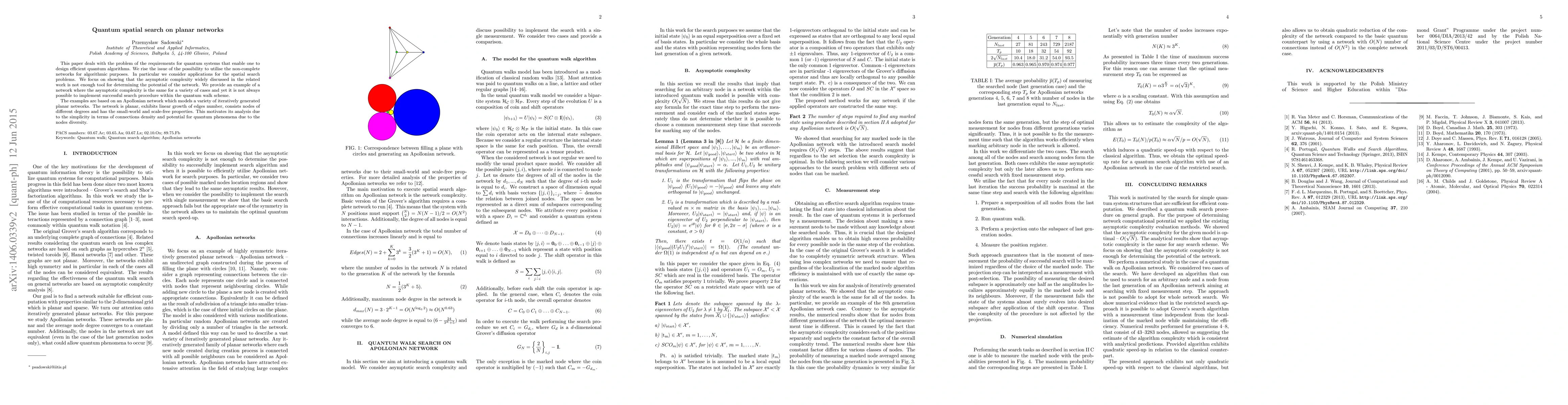 This paper deals with the problem of the requirements for quantum systems that enable one to design efficient quantum algorithms. We rise the issue of the possibility to utilise the non-complete networks for algorithmic purposes. In particular we consider applications for the spatial search problems. We focus on showing that the asymptotic complexity widely discussed in the related work is not enough tool for determining the potential of the network. We provide an example of a network where the asymptotic complexity is the same for a variety of cases and yet it is not always possible to implement successful search procedure within the quantum walk scheme. The examples are based on an Apollonian network which models a variety of iteratively generated planar networks. The network is planar, exhibits linear growth of edges number, consists nodes of different degrees and has the small-world and scale-free properties. This motivates its analysis due to the simplicity in terms of connections density and potential for quantum phenomena due to the nodes diversity.