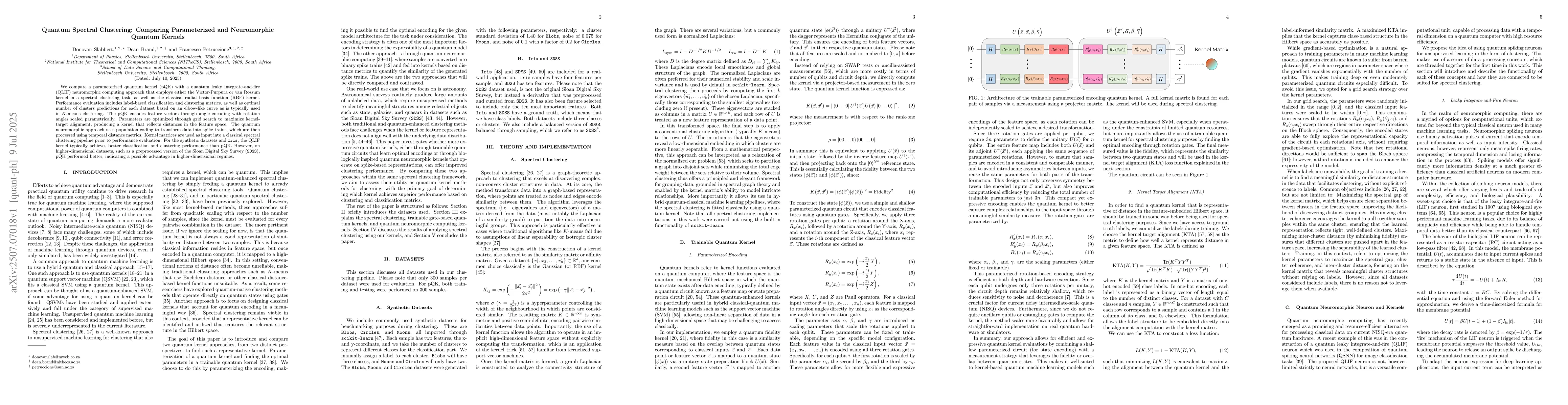 We compare a parameterized quantum kernel (pQK) with a quantum leaky integrate-and-fire (QLIF) neuromorphic computing approach that employs either the Victor-Purpura or van Rossum kernel in a spectral clustering task, as well as the classical radial basis function (RBF) kernel. Performance evaluation includes label-based classification and clustering metrics, as well as optimal number of clusters predictions for each dataset based on an elbow-like curve as is typically used in $K$-means clustering. The pQK encodes feature vectors through angle encoding with rotation angles scaled parametrically. Parameters are optimized through grid search to maximize kernel-target alignment, producing a kernel that reflects distances in the feature space. The quantum neuromorphic approach uses population coding to transform data into spike trains, which are then processed using temporal distance metrics. Kernel matrices are used as input into a classical spectral clustering pipeline prior to performance evaluation. For the synthetic datasets and \texttt{Iris}, the QLIF kernel typically achieves better classification and clustering performance than pQK. However, on higher-dimensional datasets, such as a preprocessed version of the Sloan Digital Sky Survey (\texttt{SDSS}), pQK performed better, indicating a possible advantage in higher-dimensional regimes.