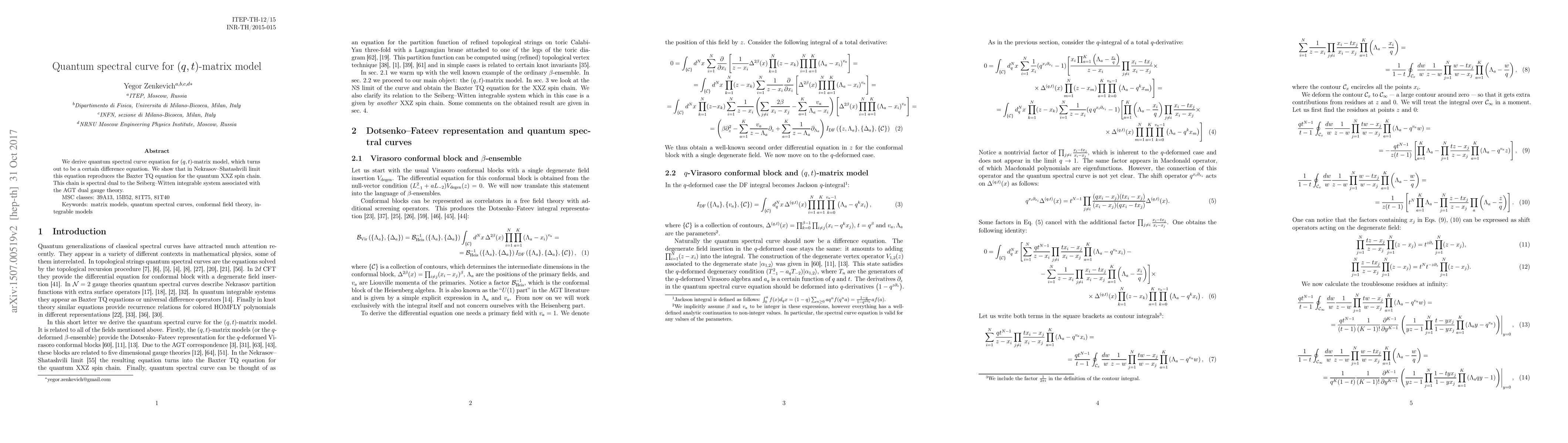 We derive quantum spectral curve equation for (q,t)-matrix model, which turns out to be a certain difference equation. We show that in Nekrasov-Shatashvili limit this equation reproduces the Baxter TQ equation for the quantum XXZ spin chain. This chain is spectral dual to the Seiberg-Witten integrable system associated with the AGT dual gauge theory.