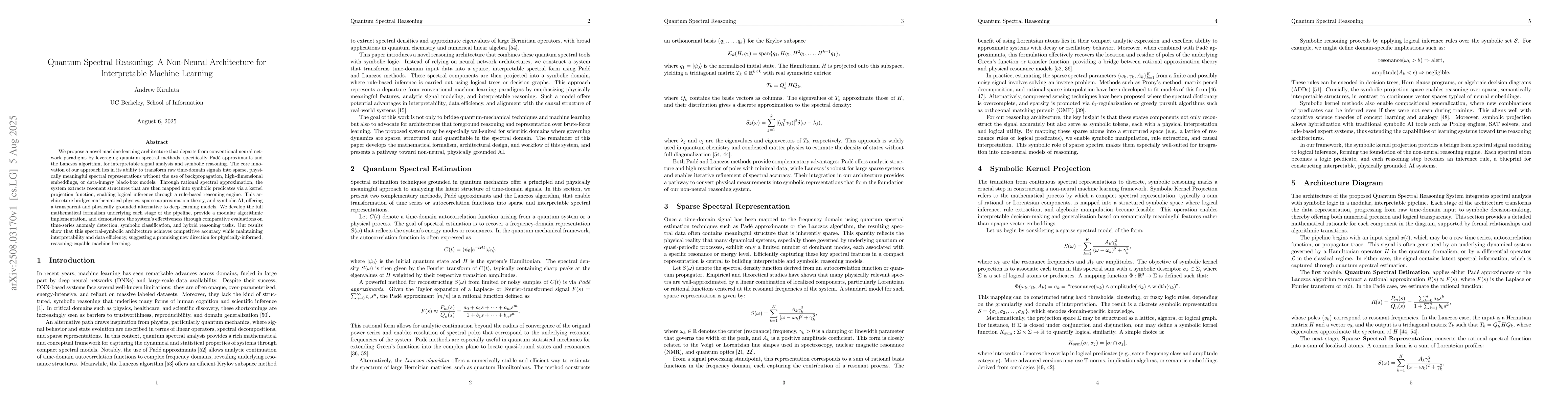 We propose a novel machine learning architecture that departs from conventional neural network paradigms by leveraging quantum spectral methods, specifically Pade approximants and the Lanczos algorithm, for interpretable signal analysis and symbolic reasoning. The core innovation of our approach lies in its ability to transform raw time-domain signals into sparse, physically meaningful spectral representations without the use of backpropagation, high-dimensional embeddings, or data-intensive black-box models. Through rational spectral approximation, the system extracts resonant structures that are then mapped into symbolic predicates via a kernel projection function, enabling logical inference through a rule-based reasoning engine. This architecture bridges mathematical physics, sparse approximation theory, and symbolic artificial intelligence, offering a transparent and physically grounded alternative to deep learning models. We develop the full mathematical formalism underlying each stage of the pipeline, provide a modular algorithmic implementation, and demonstrate the system's effectiveness through comparative evaluations on time-series anomaly detection, symbolic classification, and hybrid reasoning tasks. Our results show that this spectral-symbolic architecture achieves competitive accuracy while maintaining interpretability and data efficiency, suggesting a promising new direction for physically-informed, reasoning-capable machine learning.