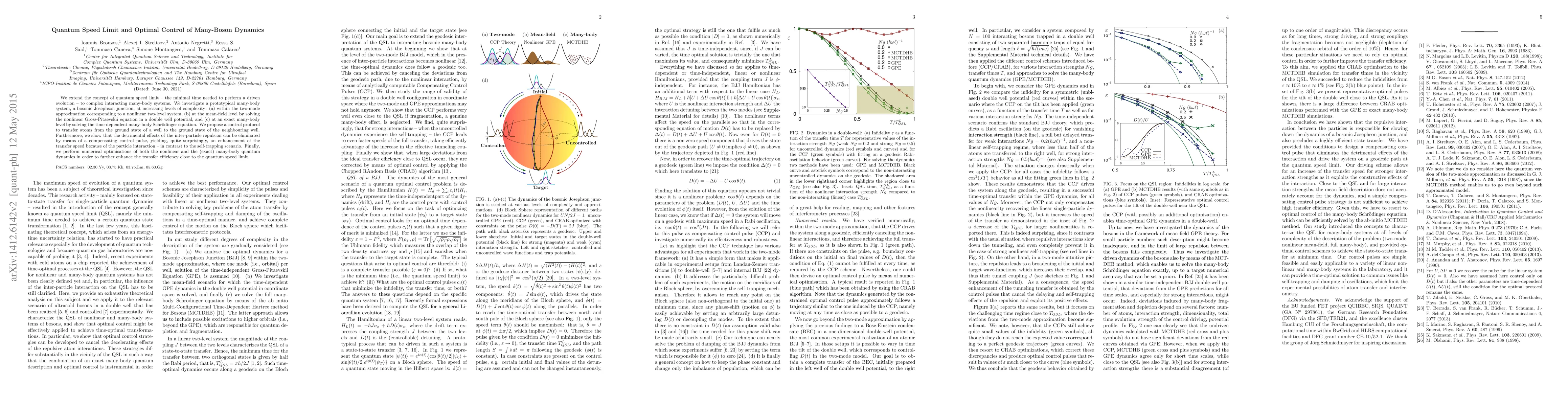 We extend the concept of quantum speed limit -- the minimal time needed to perform a driven evolution -- to complex interacting many-body systems. We investigate a prototypical many-body system, a bosonic Josephson junction, at increasing levels of complexity: (a) within the two-mode approximation {corresponding to} a nonlinear two-level system, (b) at the mean-field level by solving the nonlinear Gross-Pitaevskii equation in a double well potential, and (c) at an exact many-body level by solving the time-dependent many-body Schr\"odinger equation. We propose a control protocol to transfer atoms from the ground state of a well to the ground state of the neighbouring well. Furthermore, we show that the detrimental effects of the inter-particle repulsion can be eliminated by means of a compensating control pulse, yielding, quite surprisingly, an enhancement of the transfer speed because of the particle interaction -- in contrast to the self-trapping scenario. Finally, we perform numerical optimisations of both the nonlinear and the (exact) many-body quantum dynamics in order to further enhance the transfer efficiency close to the quantum speed limit.
