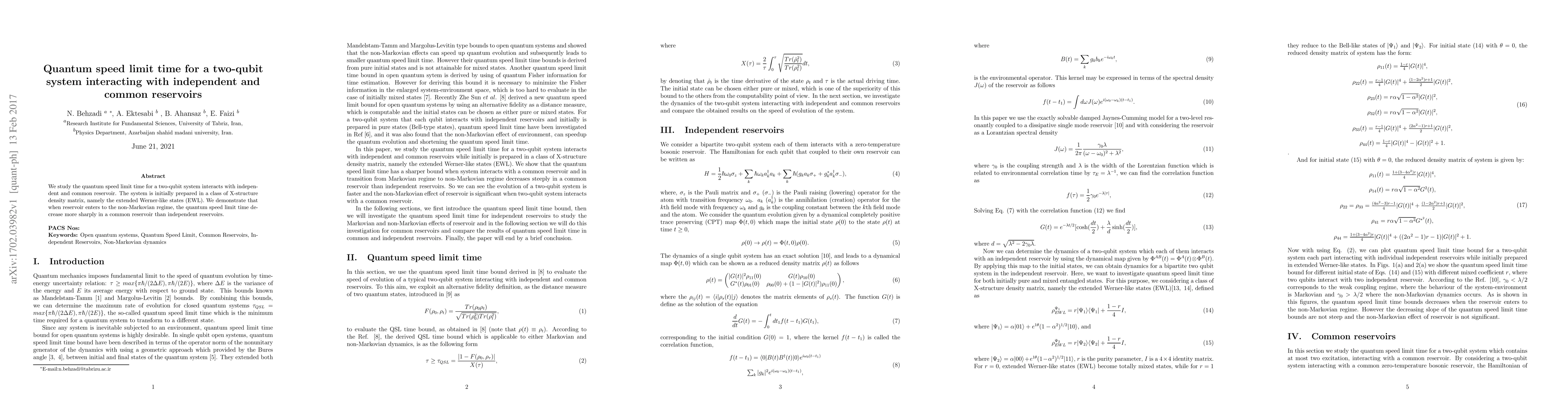 This paper investigates the quantum speed limit time for a two-qubit system interacting with either independent or common reservoirs, initially prepared in extended Werner-like states. It finds that non-Markovian dynamics lead to a more pronounced decrease in the quantum speed limit time when the system interacts with a common reservoir compared to independent reservoirs.