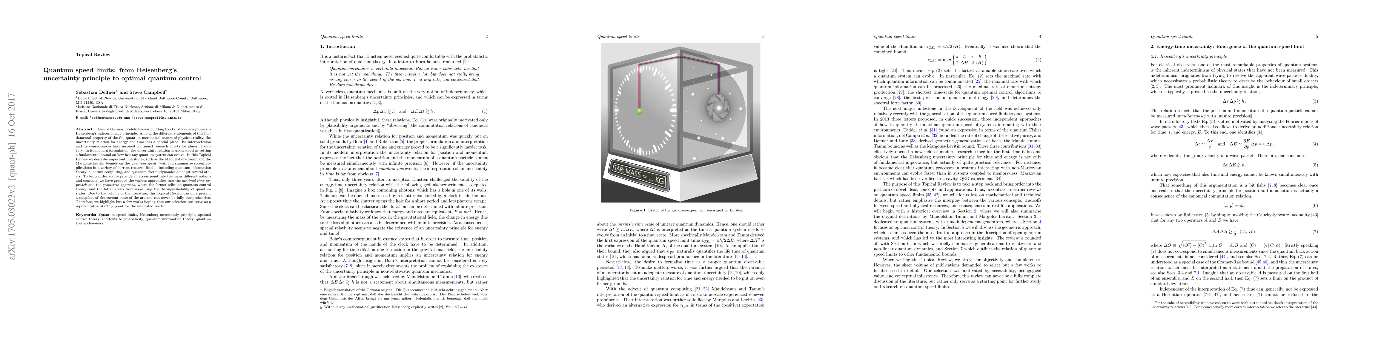 One of the most widely known building blocks of modern physics is Heisenberg's indeterminacy principle. Among the different statements of this fundamental property of the full quantum mechanical nature of physical reality, the uncertainty relation for energy and time has a special place. Its interpretation and its consequences have inspired continued research efforts for almost a century. In its modern formulation, the uncertainty relation is understood as setting a fundamental bound on how fast any quantum system can evolve. In this Topical Review we describe important milestones, such as the Mandelstam-Tamm and the Margolus-Levitin bounds on the quantum speed limit, and summarise recent applications in a variety of current research fields -- including quantum information theory, quantum computing, and quantum thermodynamics amongst several others. To bring order and to provide an access point into the many different notions and concepts, we have grouped the various approaches into the minimal time approach and the geometric approach, where the former relies on quantum control theory, and the latter arises from measuring the distinguishability of quantum states. Due to the volume of the literature, this Topical Review can only present a snapshot of the current state-of-the-art and can never be fully comprehensive. Therefore, we highlight but a few works hoping that our selection can serve as a representative starting point for the interested reader.