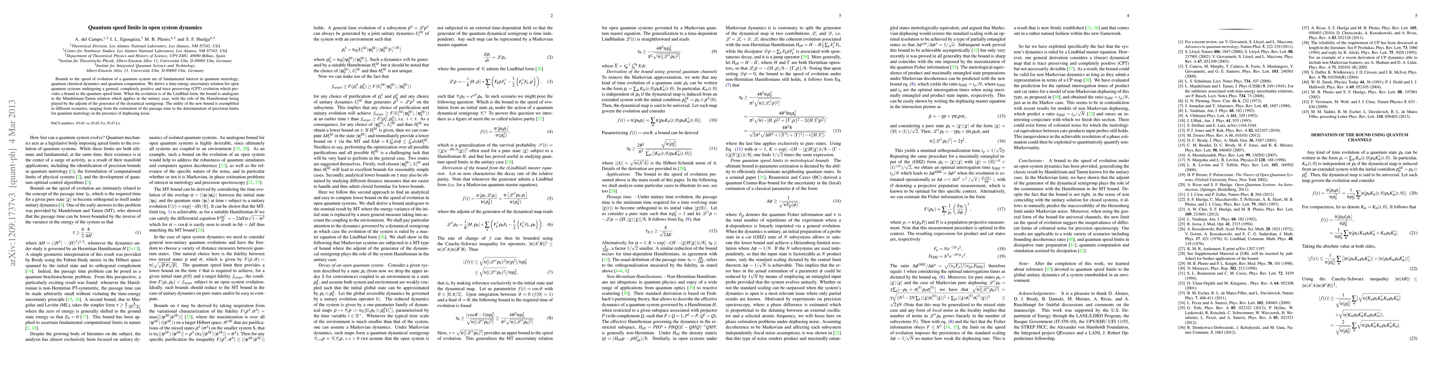 This paper derives a time-energy uncertainty relation for open quantum systems undergoing non-unitary evolution, providing a quantum speed limit bound. The bound is analogous to the Mandelstam-Tamm relation for unitary evolution, and is demonstrated to be useful in estimating passage times and precision limits in quantum metrology with dephasing noise.