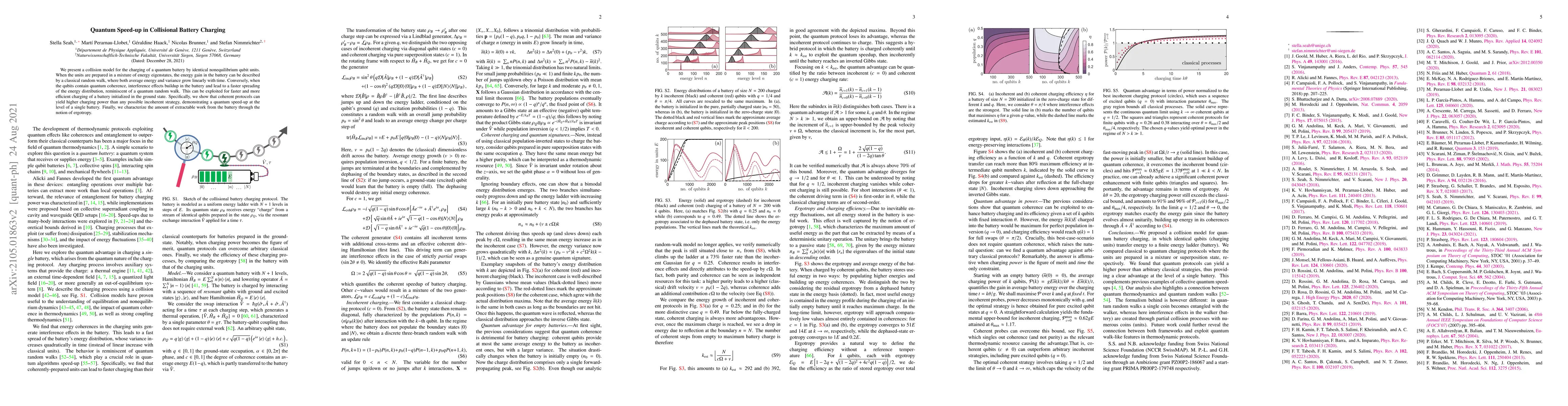 We present a collision model for the charging of a quantum battery by identical nonequilibrium qubit units. When the units are prepared in a mixture of energy eigenstates, the energy gain in the battery can be described by a classical random walk, where both average energy and variance grow linearly with time. Conversely, when the qubits contain quantum coherence, interference effects buildup in the battery and lead to a faster spreading of the energy distribution, reminiscent of a quantum random walk. This can be exploited for faster and more efficient charging of a battery initialized in the ground state. Specifically, we show that coherent protocols can yield higher charging power than any possible incoherent strategy, demonstrating a quantum speed-up at the level of a single battery. Finally, we characterize the amount of extractable work from the battery through the notion of ergotropy.