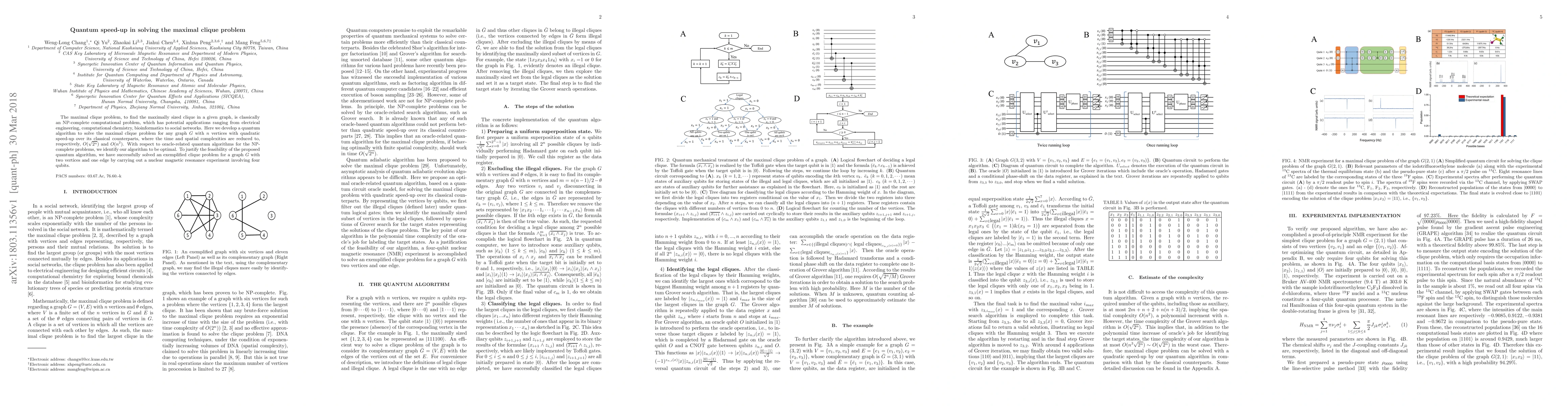 A quantum algorithm solves the maximal clique problem with a quadratic speed-up over classical methods, reducing time complexity to $O( oot{2^{n}} a)$ and spatial complexity to $O(n^2)$. This breakthrough has significant implications for fields like electrical engineering and bioinformatics.