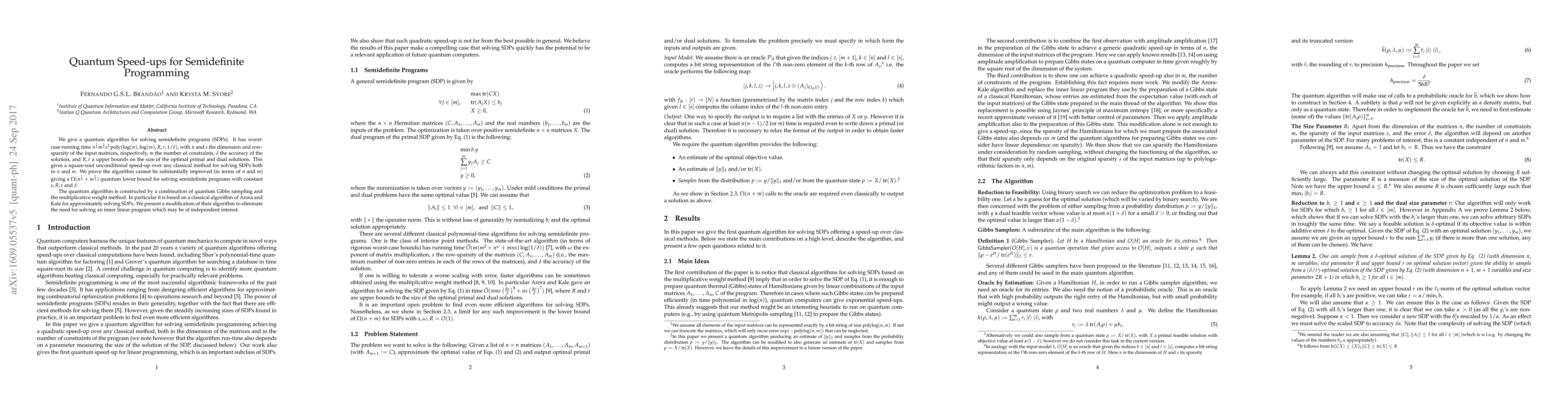 This paper introduces a quantum algorithm for solving semidefinite programs (SDPs) with a runtime of n^0.5 m^0.5 s^2 poly(log(n), log(m), R, r, 1/δ), providing a square-root speed-up over classical methods. A quantum lower bound of Ω(n^0.5 + m^0.5) is also proven, demonstrating the algorithm's optimality. The method combines quantum Gibbs sampling and the multiplicative weight method, building upon a classical SDP-solving algorithm by Arora and Kale.