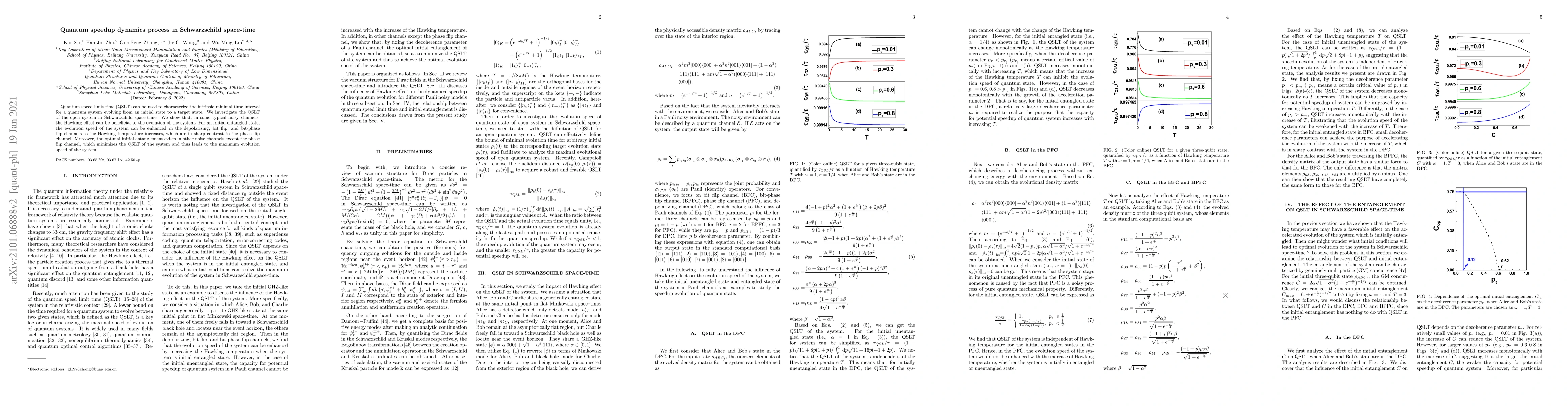 This paper investigates the quantum speed limit time (QSLT) in Schwarzschild space-time for an open system, revealing that the Hawking effect can enhance the evolution speed in certain noisy channels. It finds that increased Hawking temperature benefits the depolarizing, bit flip, and bit-phase flip channels, while the phase flip channel is negatively affected, and optimal initial entanglement minimizes QSLT and maximizes system evolution speed.