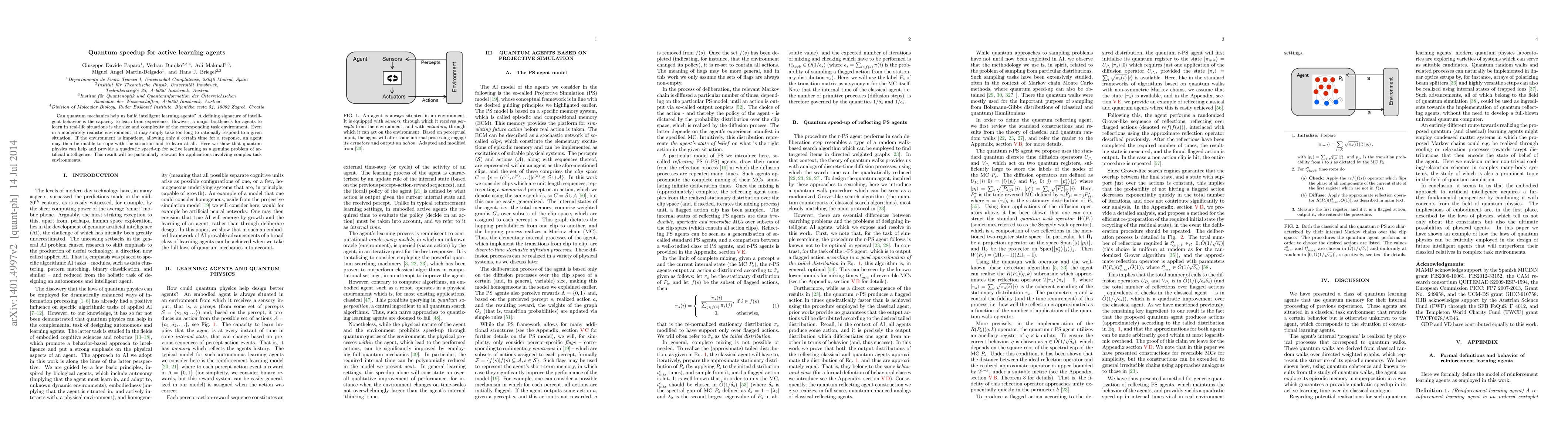 Can quantum mechanics help us in building intelligent robots and agents? One of the defining characteristics of intelligent behavior is the capacity to learn from experience. However, a major bottleneck for agents to learn in any real-life situation is the size and complexity of the corresponding task environment. Owing to, e.g., a large space of possible strategies, learning is typically slow. Even for a moderate task environment, it may simply take too long to rationally respond to a given situation. If the environment is impatient, allowing only a certain time for a response, an agent may then be unable to cope with the situation and to learn at all. Here we show that quantum physics can help and provide a significant speed-up for active learning as a genuine problem of artificial intelligence. We introduce a large class of quantum learning agents for which we show a quadratic boost in their active learning efficiency over their classical analogues. This result will be particularly relevant for applications involving complex task environments.
