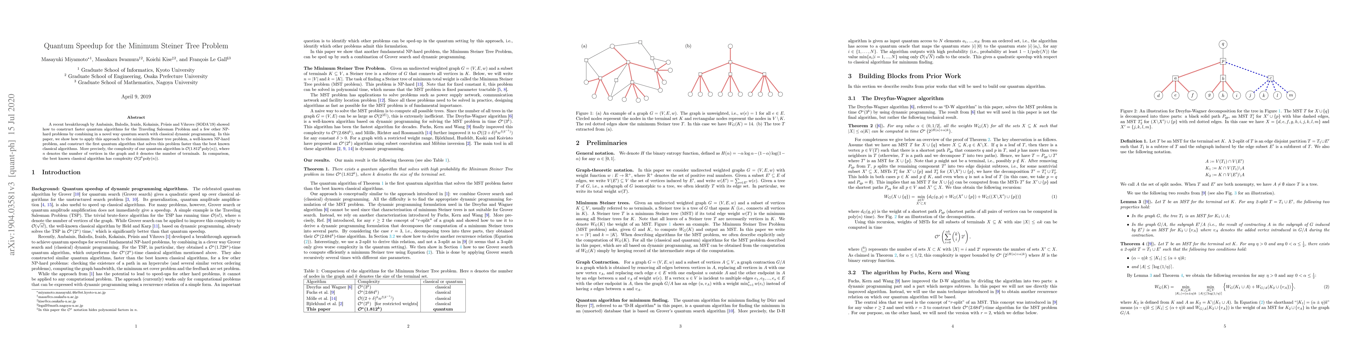 A recent breakthrough by Ambainis, Balodis, Iraids, Kokainis, Pr\=usis and Vihrovs (SODA'19) showed how to construct faster quantum algorithms for the Traveling Salesman Problem and a few other NP-hard problems by combining in a novel way quantum search with classical dynamic programming. In this paper, we show how to apply this approach to the minimum Steiner tree problem, a well-known NP-hard problem, and construct the first quantum algorithm that solves this problem faster than the best known classical algorithms. More precisely, the complexity of our quantum algorithm is $\mathcal{O}(1.812^k\poly(n))$, where $n$ denotes the number of vertices in the graph and $k$ denotes the number of terminals. In comparison, the best known classical algorithm has complexity $\mathcal{O}(2^k\poly(n))$.